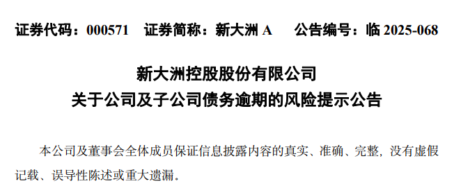 刚依附4天2涨停劳绩市场热度的新大洲A突然爆雷。 12月8日晚间,新大洲A(000571)公布 “关于公司及子公司债务过期 的风险提醒 公告”称,公司存在掉 去其核心收入泉源的五九团体掌握 权进而可能触及退市风险警示情况。