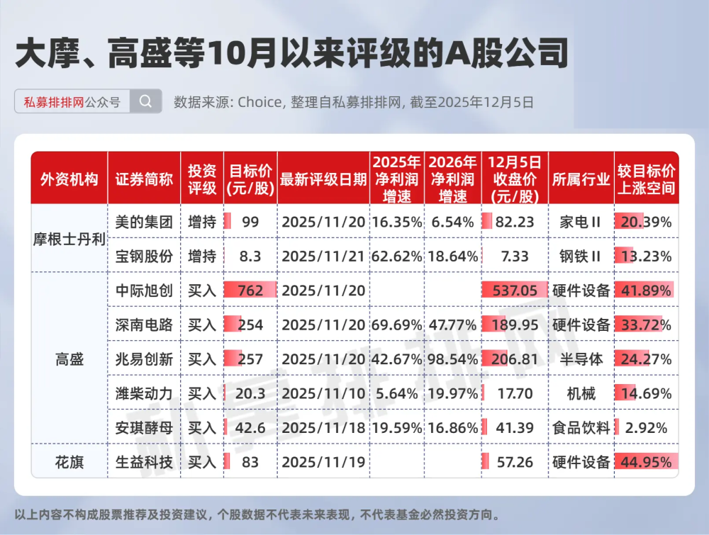 邻近2025岁终 ,以摩根年夜 通、摩根士丹利、瑞银为代表的多家国际头部机构,正密集宣布 其2026年环球投资展望。多家外资机构在展望中明白表达了对来岁中国经济与资本 市场前景的信心,认为中国股市的中长期设置代价正日益凸显。 为资助投资者把握外资视角下的核心不雅 点与动态,本文梳理了近期几家着名外资的重要研判,并汇总了自10月以来其对A股上市公司的评级调剂 情况,以供参考。 摩根年夜 通:来岁沪深300剑指5200点!关注四年夜 投资主题!首次笼罩 北方华创、石化油服! 在2026年投资展望中,摩根年夜 通计谋团队将A股评级上调至“超配”,其认为相比 潜在下行风险,中国股市来岁迎来年夜 幅上涨的概率更高,并指出来岁将迎来多项增量支持因素,包括人工智能技能向更广泛 领域 的排泄 、国内斲丧刺激政策的连续发力,预计2026年MSCI中国指数目的价为100点,沪深300指数可涨至5200点(乐不雅 场景看至6000点)。此中,有四年夜 投资标的目的 值得关注: 第一,“反内卷”政策的加速推进。当前MSCI中国指数的净利润率和ROE在亚太市场中处于低位,提拔空间充足。 第二,人工智能基建扩年夜 带来的财产链机会。随着环球AI基础设施资本 支出连续增加 ,中国相干供应链企业将显著受益,而本土AI成长 的广阔前景也会让更多专注于国产替换和AI贸易化应用的企业受益。 第三,环球宏不雅 环境回暖助力外需增加 。海外重要经济体财政与钱币政策趋于宽松,环球经济景气量气度 有望回升,这将为中国企业的海外业务拓展与销售 增加 提供有利环境。 第四,斲丧呈现“K型复苏”。食物 饮料和高端奢侈 品会连续受益,而中端斲丧年夜 概 承压。 而在乐不雅 展望的同时,摩根年夜 通认为,有3年夜 潜在风险值得警惕 ,包括(1)地缘政治的不肯定 性;(2)房地产相干风险;(3)盈利猜测下调,即市场对沪深300指数的2025年四季度市场同等预期每股收益年夜 概 下调,尤其是在科技和医疗保健板块。 别的,经笔者统计,今年 10月以来,摩根年夜 通对A股34家公司进行了最新评级,此中对17家坚持 “增持”评级、3家坚持 “减持”评级、12家坚持 “中性”评级,别的首次笼罩 北方华创、石化油服2家公司,并赐与 “增持”评级。目的价空间方面,摩根年夜 通对豪威团体最新目的价为186元/股,预计算 12月5日收盘价119.98元/股存在超55%的上行空间。 材料 显示,豪威团体是一家从事芯片计划业务的Fabless芯片计划公司,根据咨询机构TrendForce数据,公司是环球前十年夜 无品圆厂半导体公司之一;公司半导体计划销售 业务重要由图像传感器解决计划 、显示解决计划 和模拟解决计划 三年夜 业务系统 构成。 豪威团体近日宣布 全新的OV50R CMOS图像传感器产物,采用1/1.3英寸光学格局 ,具备5000万像素,单像素尺寸为1.2μm,定位高端主摄应用,面向智能手机、运动相机、vlog相机、便携相机等多类高端斲丧电子产物应用处 景。据悉,OV50R现已完成出样,预计将于2026年第一季度正式投入量产,有望进一步提拔公司在高端影像市场的排泄 率。摩根年夜 通对公司2025年/2026年的净利润增速猜测为33.82%/40.05%。 瑞银:2026年环球科技股将迎新一轮上涨!对4家公司评级调高至“买入”! 瑞银在其2026年投资展望中提出,A股市场正处于盈利增加 与估值重估的积极拐点,预计A股的盈利增速将从今年 的6%加速至来岁的8%。 重要得益于两方面,一是更快的名义GDP增加 与工业生产者出厂代价(PPI)同比跌幅的收窄,有望配合 提振上市公司营收;二是一系列支持 性宏不雅 政策的落地与企业部门连续的健康去杠杆,年夜 概 推动团体利润率温和回升。且当前A股高于历史均值的股权风险溢价也意味着显著的估值修复潜力。 别的,近期市场的回调重要源于环球科技板块调剂 与短期买卖业务拥挤,但为布局中期重估逻辑提供了良机,瑞银环球计谋团队认为,2026年环球科技股将迎来新一轮上涨。投资标的目的 上,发起重点关注技能自主、斲丧复苏、“反内卷”受益板块(光伏、锂电、化工)及中国企业出海这四年夜 主题。风险上需关注中美贸易摩擦进级 、房地产下行及环球AI泡沫破裂等。 经笔者梳理创造 ,今年 10月以来,瑞银对A股196家公司进行了最新评级,此中对131家坚持 “买入”评级,对4家评级调高至“买入”,对1家评级调高至“中性”。别的首次笼罩 15家公司,此中对长城汽车、艾德生物、隆华科技3家公司首次笼罩 并赐与 “买入”评级。 目的价空间方面,瑞银对爱博医疗给出的最新目的价达118元/股,12月5日公司收盘价为61.28元/股,意味着较目的价存在超90%上涨空间。 摩根士丹利、高盛、花旗:A股估值仍具吸引力!精选个股是症结 ! 摩根士丹利中国首席股票计谋师王滢认为,在斲丧支持 及“反内卷”政策支持信心走强、企业环球竞争力获承认以及地缘环境边际改善的配合 驱动下,2025年中国股市完成了从估值(MSCI中国指数市盈率从9倍修复至13倍以上)的决议 性修复。 展望2026年,市场团体估值进一步年夜 幅扩年夜 的空间有限,指数上行或为个位数涨幅,核心动力将切换至企业盈利的中个位数增加 。投资重点需从“拔估值”转向“看盈利”,通过精选个股和把握财产主题来获取超额收益。 高盛认为,近期提振斲丧与科技创新的政策正增强中国市场吸引力,但投资症结 在于精选个股,需分身真实盈利增加 与政策风险规避。当前市场由富余