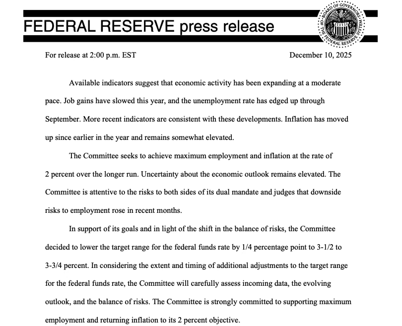 北京时间周四凌晨03:00,美联储为2025年的货币政策画上了句号:如期降息25个基点,将联邦基金利率目的区间下调至3.50%-3.75%。这是美联储一连第三次降息,全年累计降息幅度达到75个基点。然而,在这场看似平稳的“三