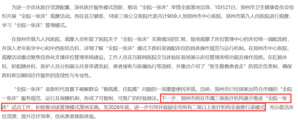 导 语“全院一张床”在部门省市真要周全 推行 了。不分科室,医生跟着患者跑!近日,郑州市卫健委宣布 工作动态,体现将在市属三级医疗机构渐渐推动 “全院一张床”试点工作,积极推动该办理 模式落地实施。至2026年底,