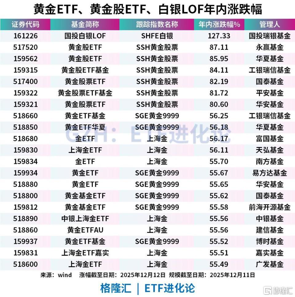 本年黄金、白银火热,白银LOF涨超127%,黄金股ETF涨超80%,黄金ETF、上海金ETF涨超50%。业内以为,本轮白银超级行情=宏观转向×工业爆发×供需缺口×资金鞭策 ×价值重估,五力同步共振。美联储降息:美元走弱+持有成