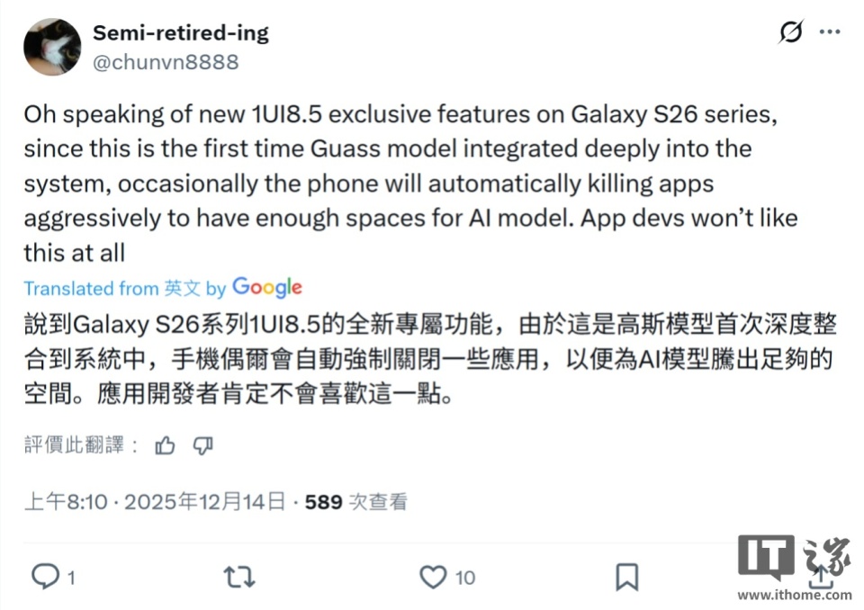 IT之家 12 月 14 日消息 ,消息 人士 Semi-retired-ing 今天在 X 平台发文称,三星 Galaxy S26 系列手机将支持“高斯”本地 AI 模型。IT之家了解 到,这项功效 将被深度整合进系统 ,不外手机可能会偶尔主动封闭 一些 App