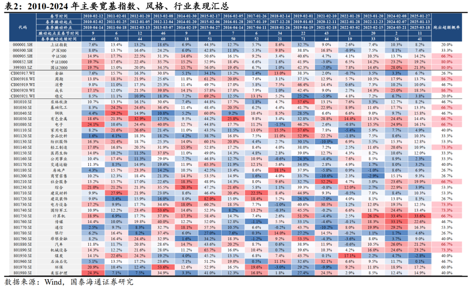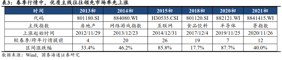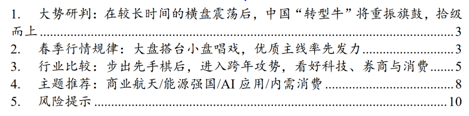 本文转载自微信公众号:国泰君安证券研究 核心不雅 点:政策预期有望上修,市场交投有望生动,在较长韶光 的横盘震动 后,中国“转型牛”将大张旗鼓,拾级而上并站上新高度。跨年攻势已经开始,看好科技/券商保险/消耗。 择要 ▶在较长韶光 的横盘震动 后,中国“转型牛”将大张旗鼓,拾级而上。11月24日上证指数跌至3800点悲不雅 之际,国泰海通策略团队判定“关键位置:进入击球区,布出先手棋”,近两周以来创业板指已根本收复掉 地。对于后市,国泰海通比市场共识 更乐不雅 :部分投资者以“跨周期”解读政策不积极存在谬误,2025年超常规是相较以2024年末部风险袒露。面向2026年,中央经济工作会议明白“巩固拓展经济稳中向好势头”,并哀求 财务政策“加倍 积极”与“内需主导”,首次 提出“鞭策 投资止跌回稳”(2025年负增加 ),并时隔十年重提房地产“去库存”;中财办副主任韩文秀表现将根据形势变化出台实行增量政策,继续实行“国补”与靠前实行“十五五”重点项目,隐含了实现“十五五”精良开局的开门红重要性。考虑近期经济活动转淡与房地产贩卖面积下滑加速,政策预期有望上修。在人夷易近 币安靖 的前提下,2026岁首年月 中国央行降息预期有望提高。在生意业务层面,保收益降仓位已经步入尾声,岁末岁首年月 的再配置与机构资金回流有望改善市场流动性和生动成交,跨年攻势已经开始了。 ▶春季行情纪律 :年夜 盘搭台小盘唱戏,优质主线率先发力。复盘2010年至今春季行情纪律 :1)春季行情通常集中于上年12月至次年4月,经验 性启动时点为春节前10–15个生意业务日。若前期市场充实调解,且政策与流动性预期向好,则启动韶光 将明显提前,如12-13 年、18-19 年、22-23年;2)春季行情风格 特征为年夜 盘搭台,小盘唱戏,以春节邻近 为分水岭。在此之前受年报预告压力、险资配置偏好等影响,以中证800为代表的年夜 盘风格 占优;春节后步入经济与古迹 空窗期,叠加流动性环境季节性改善,以中证2000为代表的中小成长明显跑赢;3)若上一年度的强势主线在岁首年月 仍具备景气支撑,高确定性将使其率先启动“估值切换”,并抢跑市场上涨。如14岁首年月 的游戏、15岁首年月 的互联网+、20岁首年月 的半导体以及21岁首年月 的茅指数。考虑到前期股指的年夜 幅调解、总量政策加码与增量入市环境,当下是布局春季行情的重要窗口。春节前具备财产趋势的年夜 盘成长有望占优,受益险资“开门红”配置的年夜 盘代价也有望反弹。 ▶行业比力:步出先手棋后,进入跨年攻势:看好科技、券商与消耗。中央经济工作会议一连积极的宏不雅 政策立场,器重短期的扩年夜 内需和中恒久的“内功”修炼,组合增加打击性。看好:1)科技成长:AI模型 和运用 希望加速,国内算力底子方法 缺少 。保举:港股互联网/传媒/盘算机/算力,以及具备环球竞争上风的制作 业出海:电力设备 /机器设备 。2)年夜 金融:资本市场改革纵深有望重振风偏,保举:券商/保险。3)顺周期:调解三年后,估值与持仓处于低位,消耗板块景气线索增多,保举低股价、低库存、景气改善的消耗股:食物 饮料/农林牧渔/旅店/旅游服务;周期看好有色/化工。 ▶主题保举:1、商业航天:长征十二甲火箭发射期近 与星座组网加速,看好液体火箭/卫星载荷/发射场。2、能源强国:扩年夜 绿电运用 成为能源计谋 重点,看好智能电网/新型储能/核聚变能。3、AI运用 :中央提出深化拓展人工智能+,看好港股互联网/数据中心电力。4、内需消耗:创建强年夜 国内市场,看好新兴消耗/赛事经济/冰雪旅游。 ▶风险提示 :海外 经济阑珊超预期,环球地缘政治的不确定性。 目次 01 年夜 势研判:在较长韶光 的横盘震动 后,中国“转型牛”将大张旗鼓,拾级而上 在较长韶光 的横盘震动 后,中国“转型牛”将大张旗鼓,拾级而上。11月24日上证指数跌至3800点悲不雅 之际,国泰海通策略团队判定“关键位置:进入击球区,布出先手棋”,近两周以来创业板指已根本收复掉 地。对于后市,国泰海通比市场共识 更乐不雅 :部分投资者以“跨周期”解读政策不积极存在谬误,2025年超常规是相较以2024年末部风险袒露。面向2026年,中央经济工作会议明白“巩固拓展经济稳中向好势头”,并哀求 财务政策“加倍 积极”与“内需主导”,首次 提出“鞭策 投资止跌回稳”(2025年负增加 ),并时隔十年重提房地产“去库存”;中财办副主任韩文秀表现将根据形势变化出台实行增量政策,继续实行“国补”与靠前实行“十五五”重点项目,隐含了实现“十五五”精良开局的开门红重要性。考虑近期经济活动转淡与房地产贩卖面积下滑加速,政策预期有望上修。在人夷易近 币安靖 的前提下,2026年中国央行降息预期有望提高。在生意业务层面,保收益降仓位已经步入尾声,岁末岁首年月 的再配置与机构资金回流有望改善市场流动性和生动成交,跨年攻势已经开始了。 02 春季行情纪律 :年夜 盘搭台小盘唱戏,优质主线率先发力 春季行情纪律 :年夜 盘搭台小盘唱戏,优质主线率先发力。复盘2010年至今春季行情纪律 :1)春季行情通常集中于上年12月至次年4月,经验 性启动时点为春节前10–15个生意业务日。若前期市场充实调解,且政策与流动性预期向好,则启动韶光 将明显提前,如12-13 年、18-19 年、22-23年;2)春季行情风格 特征为年夜 盘搭台,小盘唱戏,以春节