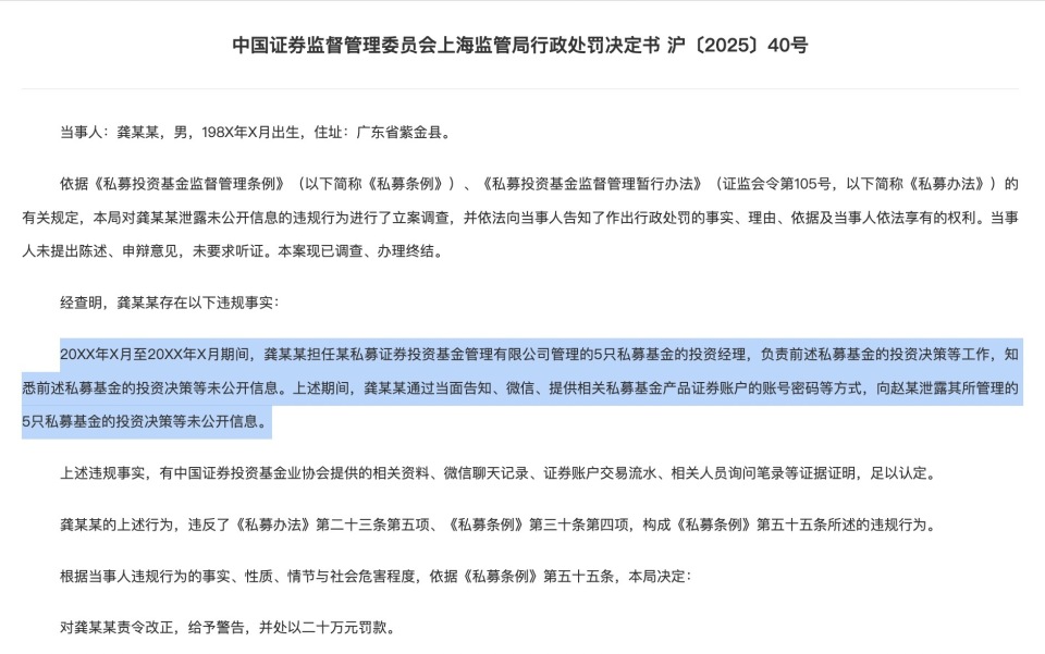 财联社12月14日讯(记者 封其娟)陪同着监管层罚单的陆续披露,私募走漏信息事件频发,叠加数字化转型带来的全新风控挑战,行业风控短板日益凸显。 上海证监局最新披露,针对龚某某走漏未公开信息的违规举动,该局责令改正,给予 警告,并处以20万元罚款。 罚单表现,龚某某曾任职于某证券类私募,担当5只私募产品的投资经理,负责并知悉投资决议等工作。在任期间,龚某某经由过程 劈面 告知、微信、提供干系私募基金产品证券账户的账号密码等方法 ,向赵某走漏前述5只私募基金的投资决议等未公开信息。 比年来,上海证监局多份罚单表现,私募投资经理已成信息走漏高发群体。本年7月,该局曾对3位私募投资经理的信息走漏举动同时开具罚单,3人均被罚款50万元。 除了信息走漏,投研人员利用未公开信息进行趋同交易的案例同样频发,干系案例不胜罗列。 随着资管行业数字化水平加深,信息走漏与违规交易的主体正从基金经理等核心投研岗,向可接触核心数据的IT、风控、运营岗扩散,这类岗亭 因掌握体系权限,违规举动每每涉及金额更大、潜伏性更强。 值得注意的是,私募及联系关系 机构中的非投研岗人员,大概成为未公开信息走漏的 “中介枢纽”。他们不直接参与基金投资决议,但基于岗亭 本能机能 合法接触到私募产品的持仓、交易记载、投资战略等未公开核心信息。 沪上一私募人士指出,相对投研岗直接泄密,非投研岗的“中介传导” 风险更难防控,缘故原由总结为三点:一黑白投研岗分布于业务部、IT公司、风控等多环节,属于监管与机构风控的传统盲区;二是信息传导链条多环节跳转,溯源取证难度极大;三是风险易跨机构伸张,比方券商 IT 岗人员泄密大概波及多家相助私募,最终捣乱 资本市场公正 秩序,侵害平凡投资者优点。 对此,另一业内人士夸大,私募机构必需 创建严酷的信息隔离墙制度,明确划分核心信息的知悉范围 ,经由过程 物理隔离、网络权限控制、体系日志监控等技术本领,确保“最小授权”原则落到实处。对于联系关系 方人员的访问哀求,应实验更高等 别的审批与监控。 多位私募投资经理因走漏信息被罚 本年7月14日,上海证监局面向3位私募投资经理公布 行政处分 决议 书。由于私募机构、私募产品、基金经理等症结 信息均匿名,临时无法验证3位投资经理是否来自1家私募。 罚单指出,走漏因职务便利获取的未公开信息,张某帆、陈某、徐某均被该局责令改正,并处以50万元罚款。其中 ,陈某、徐某固然提交了报告、辩说材料,但未对本案违法究竟、法律适用、处分 裁量等提出异议 。 上海证监局指出,张某帆曾担当上海某私募旗下1只证券类基金的投资经理,负责投资决议等工作并知悉未公开信息。任职期间,张某帆对外走漏所办理 产品的投资决议等未公开信息。 任职上海某私募期间,陈某作为X只私募基金的投资经理,负责投资决议等工作,知悉投资决议等未公开信息。任期内,陈某对外走漏在管私募基金的投资决议等未公开信息。 徐某曾任职2家私募机构,曾任上海某资产办理 有限公司旗下某投顾产品指定授权代表,以及曾任上海某资产办理 中心(有限合伙)旗下某证券类私募产品的投资经理,实际负责投资决议等工作,知悉投资决议等未公开信息。任职期间,徐某对外走漏前述2只产品的投资决议等未公开信息。 信息走漏之外,私募内部人士常以职务便利,利用未公开信息进行趋同交易并获利。 客岁3月,上海贝某一投资经理乐某因利用未公开信息交易,被上海证监局责令改正,没收 违法所得30.07万元,并处以等额罚款,合计罚没60.14万元。按照 干系线索,上海贝某根本指向上海贝溢投资办理 有限公司,乐某则指向乐琪。 追溯创造 ,公募期间 的乐琪也有雷同操作。上海证监局2021年12月一则罚单指出,时任原上投摩基础 金经理的乐某,也因利用未公开信息进行趋同交易获利被罚,并被该局处以没收 违法所得165.37万元,并处以等额罚款。 同年5月,深圳证监局罚单指出,壹诺投资的投资总监李凌云利用未公开信息交易股票,责令改正之外,还被没收 违法所得326.54万元,并处以等额罚款。 比年来,从处所 证监局到证监会,对私募人士信息走漏及违法交易的处分 力度持续加码。 客岁4月,上海朴道瑞富实控人胡晓麒因利用未公开信息交易股票被证监会责令改正,没收 违法所得2439.57万元并处等额罚款,合计罚没4879.15万元。 不到半年,涂尔帆因利用未公开信息交易股票被证监会责令改正,没收 违法所得3325.84万元并处以等额罚款,合计罚没6651.69万元。鉴于违法举动情节较为严峻,该会还决议 对涂尔帆接纳6年证券市场禁入步伐。 涂尔帆自2018年8月起担当海雅金控法定代表人、执行董事、总经理,知悉公司旗下产品持仓信息、投资决议信息等未公开信息。 IT、业务部等私募联系关系 方成信息外泄渠道 资管行业在数字化转型配景下,暴露 出全新风控盲区,违规主体正从传统的基金经理等核心投研岗亭 ,快速向IT等可接触核心信息的非传统投资岗亭 伸张。 本年11月,私募IT人员林艺平因利用未公开信息交易,被浙江证监局责令改正,给予 警告,没收 违法所得8857.68万元,并处以等额罚款,合计罚没1.77亿元。鉴于违法举动情节严峻,该局又对林艺平接纳5年证券市场禁入步伐。 罚单表现,林艺平曾任职杭州某某科技有限公司(以下简称“某某科技”),承担