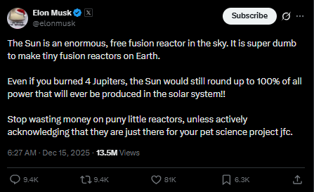 《科创板日报》12月15日讯 本日,埃隆·马斯克在外交平台X上公开唱衰核聚变发电。其开门见山道:“在地球上制作小型核聚变反应堆简直愚蠢至极。” 马斯克指出,太阳自己已是天空中一个伟年夜 的、免费的核聚变反应堆