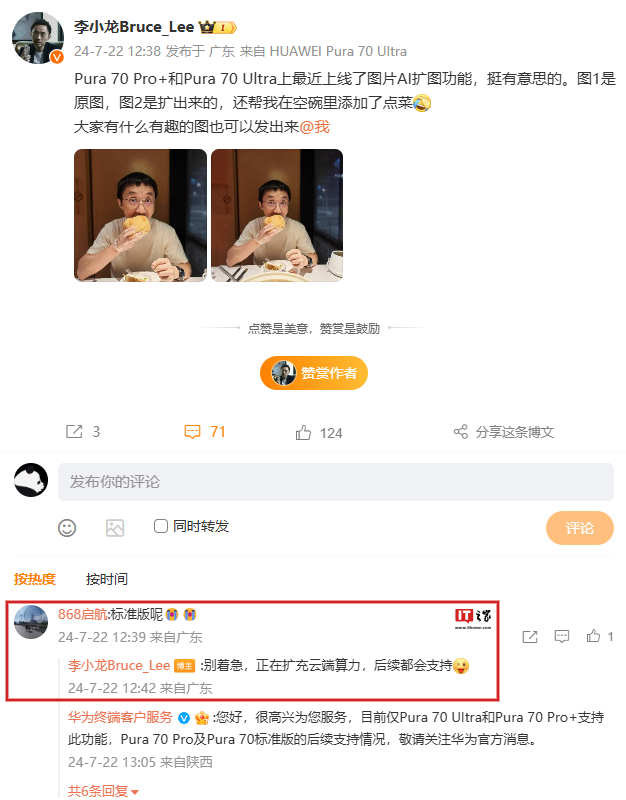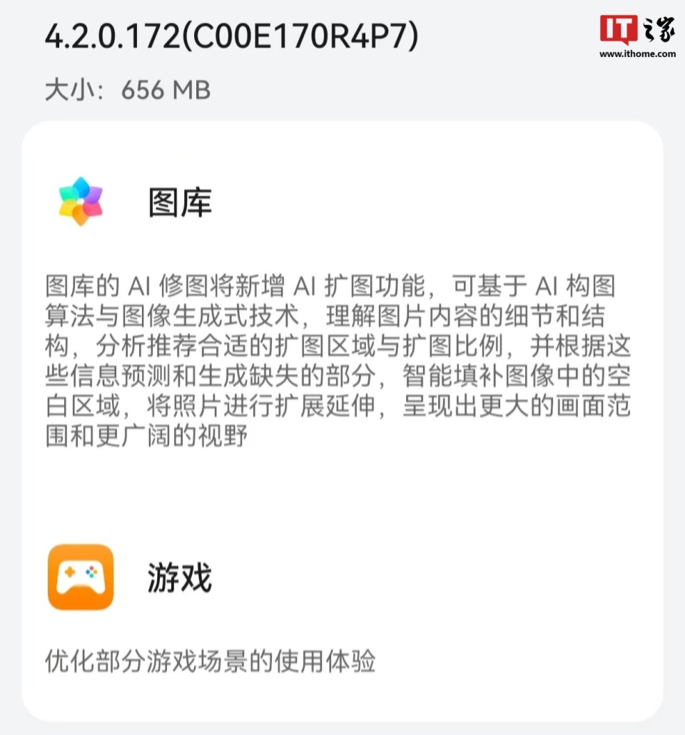 IT之家 12 月 15 日消息,客岁 7 月,华为 Pura 70 系列手机获推鸿蒙 HarmonyOS 4.2.0.172 版本升级 ,带来了新增 AI 扩图功能 ,可智能识别图片内容并推荐 扩图地区和比例,生成画面内容更多的图片。据反馈,在更新 Ha