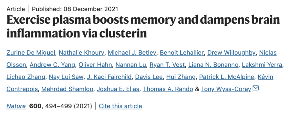 01斯坦福大学医学院神经学系领衔的跨学科团队在《天然》杂志颁发 冲破 性研究成果,显现了运动改进 认知功能的全新分子机制。研究团队经由过程 多组学剖析 发现,运动诱导发生 的血浆因子簇集蛋白(Clusterin,简称CLU)能