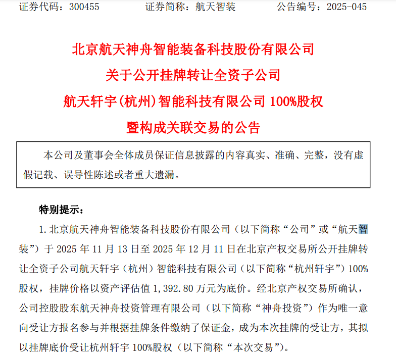 深圳商报·读创客户端记者 张弛 12月18日,航天智装(300455)关照书记 称,公司于2025年11月13日至2025年12月11日在北京产权生意业务所公开挂牌让渡 全资子公司航天轩宇(杭州)智能科技有限公司100%股权,挂牌价格以资