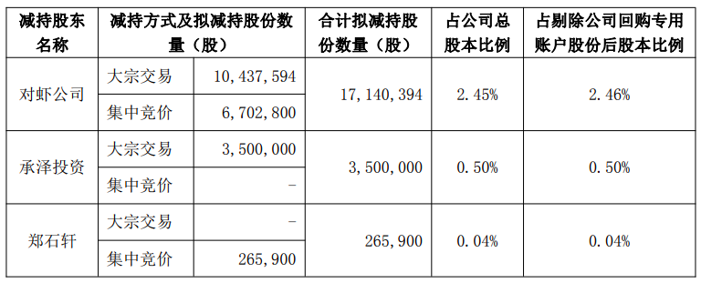 与焦点高管同步抛出减持筹划。 通知 书记 称,公司近日收到控股股东湛江市对虾饲料有限公司(以下简称“对虾公司”)、现实掌握 人(董事长兼总司理)郑石轩及其一致举措听 承泽投资出具的《上市公司股东股份减持筹划告诉 函》,以上股东筹划自2026年1月15日至4月14日合计拟减持公司股份的总数不凌驾20,906,294股,即不凌驾剔除公司回购专用账户股份后股本的3.00%,其中 年夜 宗买卖业务减持不超13,937,594股(即不凌驾剔除公司回购专用账户股份后股本的 2%),会合竞价减持不超6,968,700股(即不凌驾剔除公司回购专用账户股份后股本的1%)。 粤海饲料称,股东减持系因自身资金需要,对虾公司、承泽投资所持公司股份系公司首次公开刊行 股票并上市前持有的股份,郑石轩所持公司股份系其在二级市场增持的公司股份。本次减持筹划实行有不肯定 性,也存在能否按期实行完成的不肯定 性,不会导致公司掌握 权产生 变更。 当日,粤海饲料还通知 书记 称,公司副总司理、财务总监林冬梅和副总司理韩树林因小我 资金需求,拟于2026年1月15日至2026年4月14日以会合竞价买卖业务方法 别离 减持公司股份不凌驾8,100股(约占剔除回购专用账户股份后公司总股本的 0.0012%),累计不凌驾1.62万股,占剔除回购专用账户股份后公司总股本的0.0023%。 若以12月22日收盘价8.28元/股计算,此次控股股东、实控人及其一致举措听