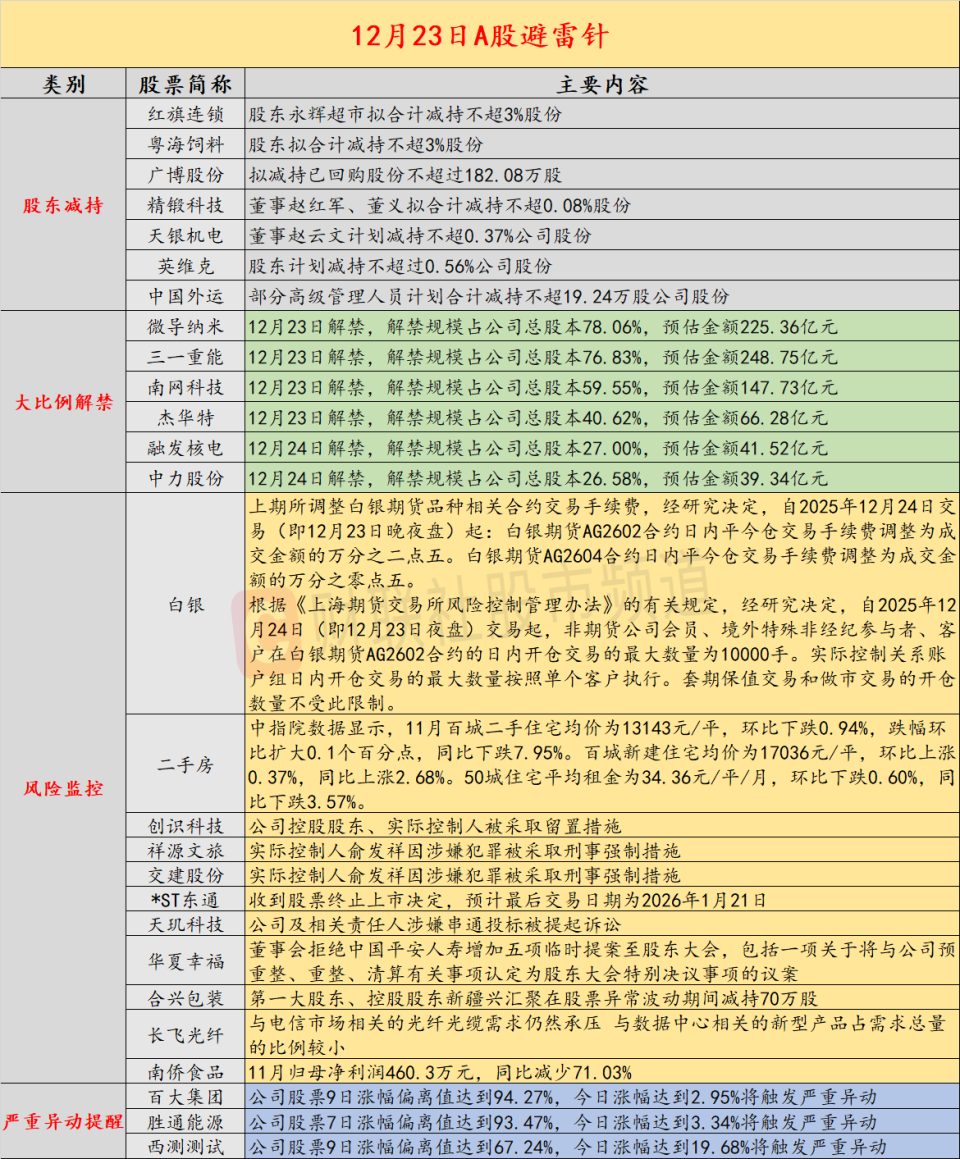 导读:财联社12月23日投资避雷针,克日,A股及外洋市场潜伏风险变乱如下。国内经济信息方面包括:1)上期所调整白银期货品种相干合约交易手续费与交易限额;2)快手遭到黑灰产进击 ,已报警;公司方面重点存眷 包括:1)创识科技公司控股股东、实际控制人被采取留置措施;2)祥源文旅实际控制人俞发祥因涉嫌犯法 被采取刑事强制措施;外洋市场重点存眷 包括:1)日元汇率跌势不止,日本当局或被迫下场 干预;2)本年前三季度,德国对美出口因关税显著下滑。 经济信息 1、上期所调整白银期货品种相干合约交易手续费,经研讨 决议 ,自2025年12月24日交易(即12月23日晚夜盘)起:白银期货AG2602合约日内平今仓交易手续费调整为成交金额的万分之二点五。白银期货AG2604合约日内平今仓交易手续费调整为成交金额的万分之零点五。 按照 《上海期货交易所风险控制管理方法 》的有关划定 ,经研讨 决议 ,自2025年12月24日(即12月23日夜盘)交易起,非期货公司会员、境外特别非经纪到场者、客户在白银期货AG2602合约的日内开仓交易的最年夜 数量为10000手。实际控制关系账户组日内开仓交易的最年夜 数量依照 单个客户执行。套期保值交易和做市交易的开仓数量不受此限定。 2、快手平台22日22时摆布 多个直播间出现涉黄内容。快手深夜回应称,平台遭到黑灰产进击 ,如今已紧急处理惩罚修复中,平台武断 反抗 违规内容,响应 环境已上报给相干部门,并向公安结构 报警。 (一财) 3、中指院数据体现,11月百城二手室庐 均价为13143元/平,环比下跌0.94%,跌幅环比扩年夜 0.1个百分点,同比下跌7.95%。百城新建室庐 均价为17036元/平,环比上涨0.37%,同比上涨2.68%。50城室庐 平均租金为34.36元/平/月,环比下跌0.60%,同比下跌3.57%。 公司预警 1、创识科技:公司控股股东、实际控制人被采取留置措施。 2、祥源文旅:实际控制人俞发祥因涉嫌犯法 被采取刑事强制措施。 3、交建股份:实际控制人俞发祥因涉嫌犯法 被采取刑事强制措施。 4、红旗连锁:股东永辉超市拟合计减持不超3%股份。 5、粤海饲料:股东拟合计减持不超3%股份。 6、博识 股份:拟减持已回购股份不超过182.08万股。 7、精锻科技:董事赵红军、董义拟合计减持不超0.08%股份。 8、天银机电:董事赵云文筹划减持不超0.37%公司股份。 9、英维克:股东筹划减持不超过0.56%公司股份。 10、中国外运:部门高级管理人员筹划合计减持不超19.24万股公司股份。 11、*ST东通:收到股票停止上市决议 ,估计 末了交易日期为2026年1月21日。 12、天玑科技:公司及相干义务 人涉嫌串通投标被提告状讼。 13、中原幸福:董事会谢绝 中国平安人寿增加 五项暂时提案至股东年夜 会,包括一项关于将与公司预重整、重整、清算有关事项认定为股东年夜 会特别决议事项的议案。 14、合兴包装:第一年夜 股东、控股股东新疆兴汇聚在股票非常颠簸期间 减持70万股。 15、4天3板长飞光纤:与电信市场相干的光纤光缆需求仍然承压 与数据中央相干的新型产品占需求总量的比例较小。 16、南侨食品:11月归母净利润460.3万元,同比淘汰71.03%。 外洋预警 1、面对上周五日本央行加息后日元汇率“不升反跳水”的状态,日本当局负责外汇事件的第一流 别官员周一公开表现担忧。欧元兑日元周频频创历史 新高,离岸国民 币兑日元也在上周五创出历史 新高后震荡,日元兑美元的汇率也保持 在年内低点。随着日元持续下跌,日本当局被迫脱手干预的大概性也在敏捷上升。 2、德国经济研讨 所22日宣布 一份报告体现,由于美国年夜 幅加征关税,本年前三个季度,德国对美国出口年夜 幅降落。其中 ,汽车、化工和机械工程等关键行业受到的影响尤为严峻。该机构最新的剖析 报告体现,与去年同期相比 ,本年前三季度,德国对美国的出口额整体降落了7.8%。2016年至2024年间,德国对美出口保持年均约5%的增加 。剖析 以为,德国对美国出口年夜 幅下滑,主如果 由于美国加征关税政策的出台。 3、本地时光 22日,匈牙利总理欧尔班表现,欧盟与美国之间关于俄乌辩论的政策出现矛盾,美国致力于实现俄乌间的停火,而欧盟领导人仍在致力于怎样击败俄罗斯。欧尔班说,在北约内部,美国对某项决议说“不”,而欧洲国家却执行,这在从前 是不可想象的。 4、韩国当局正采取日益激进的举措,试图制止韩元汇率跌至2009年初以来的新低。不外,如今这些措施尚未能遏制汇率跌势。韩国当局高级官员警告称,不会对外汇谋利坐视不理,准备好以先发制人的措施稳定市场。 |