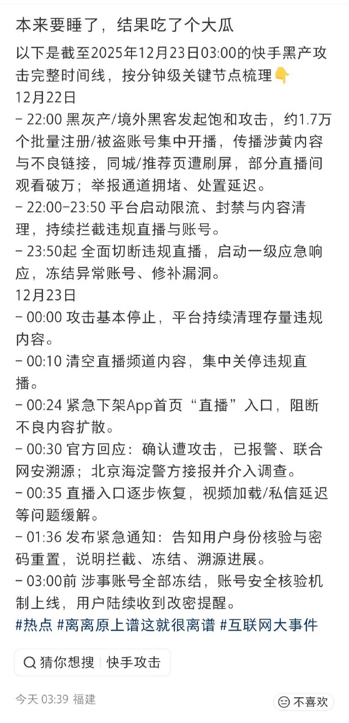 【TechWeb】12月23日,快手最新关照布告 ,经尽力处置与体系修复,快手运用 的直播功能已渐渐恢复正常服务,快手运用 的其他服务未受影响。 22日晚间,快手平台遭遇黑灰产进击 ,多个直播间出现年夜 量色情、暴力等违规内容,激发 舆论热议。截至发稿,快手股价下跌3.37%。 作为一款公正 易近 级运用 ,行业对快手网络平安 防护本领提出质疑,云云年夜 面积的进击 是如何形成的? 快手被进击 时间线曝光 在小红书、微博等社交平台,根据网友反馈,快手被进击 时间线梳理如下: 12月22日22点摆布 ,快手平台部门直播间出现涉黄、暴力内容与不良链接,同城、推荐页遭违规内容刷屏,部门直播间不雅 看透万。不少用 户对违规内容举行举报,但举报通道出现拥堵,处置延迟。 23日零点前后,快手接纳无差异关停的紧急止损步伐。随后快手直播频道彻底封闭 ,与此同时,快手的短视频欣赏、小我 中心及提现功能也出现了短暂颠簸。 1点摆布 ,快手直播功能连续恢复,涉事账号全部冻结,账号平安 核验机制上线,用户连续收到改密提醒。 快手官方对此回应,平台遭到黑灰产进击 ,响应 环境已上报给相干部门,并向公安机关报警。现在,快手运用 的直播功能已渐渐恢复正常服务,快手运用 的其他服务未受影响。 值得一提的是,在快手遭遇黑灰产进击 的同时,网上有新闻 称,快手违规直播间中隐藏着病毒链接,很多用户点入后,微信账号即被盗取,不法分子随即向账号好友发送借款请求 ,实行诱骗 。 不过,该新闻 被微信官方辟谣。微信方面表现,该新闻 不实。微信账号有严格的平安 掩护机制,截至现在,没有发现相干题目和收到类似反馈。 多位网络平安 专家分析 认为 ,此次变乱在规模 上已属于行业P0级事故,也就是最高等 别的事故。这种环境平日 会出现体系崩溃,公司焦点业务无法正常利用,且无法快速恢复,对品牌产生极其严重的影响,须要高层领导直接介入处理。 网安专家分析 背后原因 此次快手被进击 ,发作于深夜,连续数个小时。有业内子 士指出,从快手事后的应对来看,平台的应急响应 速率比较 慢,应加强应急预案。 360数字平安 团体专家分析 ,这极有大概是一场有结构 、有预谋的外部黑客进击 。从技术路径来看,进击 者大概利用了直播推流接口的底层弊端,绕过了平台的实名认证与内容考核链路。 一位了解 快手考核机制的相干人士在继承红星新闻 采访时指出,被进击 的原因是多方面的,一种大概是黑产侵入了快手的白名单权限。这时处置已超出考核部门权限,须要上升到风控以致其他一系列计谋部门。也大概是灰产直接进击 了封禁的接口。 除了外部进击 之外,奇安信平安 专家认为 ,内部弊端激发 的风险同样不容忽视。频年 来,“内鬼” 走漏数据、内部账号被盗滥用、越权操作等变乱频发,部门网络进击 乃至通过收买内部人员、利用权限弊端突破防线,其破碎摧毁 力不亚于外部突袭。 奇安信平安 专家汪列军表现,此次进击 之以是能造成年夜 规模 破碎摧毁 ,焦点原因在于黑灰产已全面迈入 “主动化进击 ” 时代 ,而平台仍依赖传统人工防御模式。黑客借助主动化对象 批量注册、操控僵尸号,实现违规内容的秒级发布与扩散,这种规模 化进击 完整 超出人工考核的应对极限。 传统人工考核存在自然滞后性,面对每秒数十条的违规内容大水 ,每每陷入 “封禁不及新增” 的被动局势 ,即便增派人手也难以弥补攻防服从差。 此次年夜 面积进击 变乱也为更多平台企业敲响警钟,在黑灰产本领连续升级的背景下,网络平安 范畴的竞争,早已不然 则 技术更新快慢的比拼,更是防护体系 完备程度的对决。当进击 者已经开始 用AI武装自己,防御者唯一的前途 就是用更先辈的AI技术构筑防线。 截至发稿,快手尚未公开技术复盘报告 或进击 证据。(周小白) |