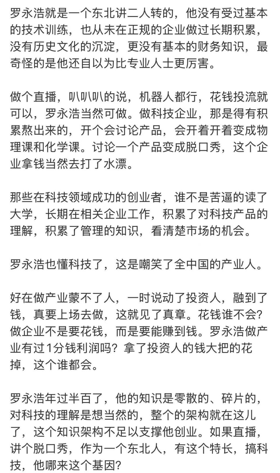 本日,项立刚更新《罗永浩创业为什么不成功》系列文章,称罗永浩缺少常识 积累。项立刚称罗永浩要创业,比我还差了几个层次 ,他不光没有上过大学,乃至没有很好的完成中学学业,不停是个文科生,直到本日依然如此 。项