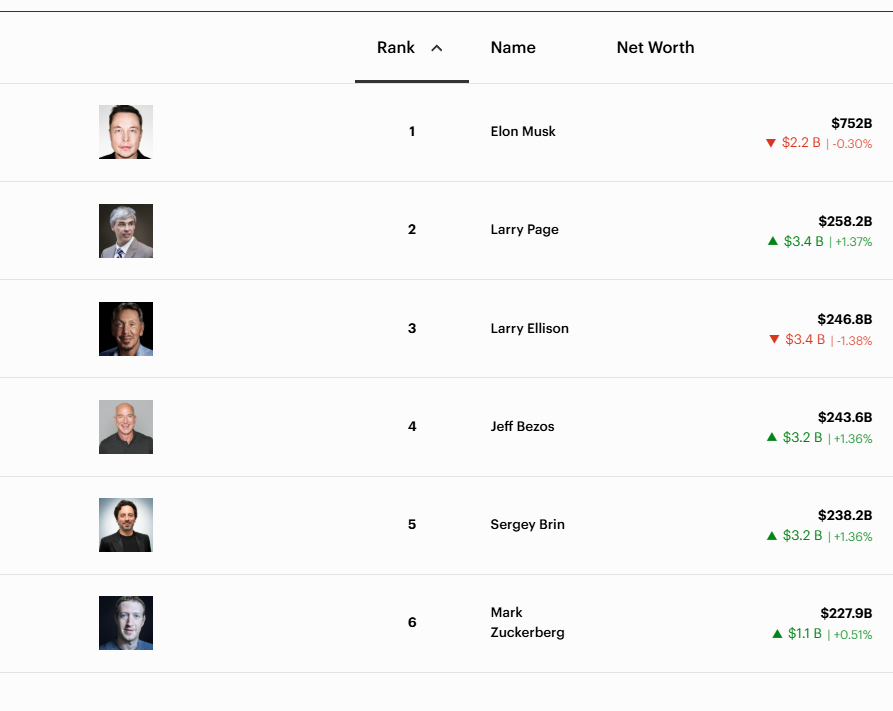 本文泉源:期间周报 作者:马欢 全球首富更富有了。 《福布斯》及时亿万富豪榜显示,截至2025年12月24日,马斯克的净资产跃升至约7520亿美元(约合人平易近 币5.28万亿元),成为历史 上首位净资产冲破 7000亿美元的小我 。 就在2025年初福布斯宣布 全球富豪榜时,马斯克的身家约为3420亿美元,现在还不到一年时光 ,他的身家已经飙涨了一倍多,超过了榜单上第2至第4名(谷歌团结创始人拉里·佩奇、甲骨文创始人拉里·埃里森、亚马逊创始人贝索斯)的总和。 马斯克的2025年并非一帆风顺。今年年初,他出任美国“当局服从部”负责人,其年夜 刀阔斧的改革 ,在联邦当局内激发 了不小的争议与紊乱,终极黯然退场。期间 ,马斯克掌舵的特斯拉一度遭遇 了平易近 众抗议,股价和市值暴跌。 不外,在白宫折腾了近半年,依然不影响马斯克旗下的特斯拉、火箭公司SpaceX还有人工智能公司xAI事迹 不错。随着12月19日,美公法 院作出最新判决 ,答应马斯克在特斯拉拿天价高薪,其小我 净资产便冲破 7000亿美元年夜 关,成为历史 第一人。 谁升了,谁降了 马斯克之后,排名第二的是谷歌创始人之一拉里·佩奇,小我 财富达到 了2582亿美元。拉里·佩奇凭借着谷歌今年的强劲事迹 ,已逾越Meta首席执行官扎克伯格和贝佐斯,在福布斯全球富豪榜排名第2。 谷歌另一位创始人谢尔盖·布林则以2382亿美元的小我 资产排名第5。 捧出两位世界 前五的富豪,源于谷歌在2025年表现亮眼。其母公司Alphabet第三季度营收、利润及全年资本 开支指引全面 逾越 预期,营收首破1000亿美元,多个焦点营业 实现两位数增长 ,得以让两位创始人的小我 财富年夜 幅增长。 2025年排名上升的富豪还有甲骨文创始人拉里·埃里森。甲骨文公司在2025年龄迹 暴涨,拉里·埃里森的财富也实现了惊人的逆袭,净资产一度在9月19日1天之内激增885亿美元,达到 3830亿美元。虽然现在有所下滑,但依然凭借着2468亿美元的财富,在富豪榜上排名第3。 相比之下,马斯克的老敌手 贝索斯排名下滑明显。曾经,这位亚马逊前CEO小我 财富排名全球第一,即便厥后被马斯克超过,也与后者相差不年夜 。但自从亚马逊卸任后,贝索斯的排名就一路下滑,目前凭借着2436亿美元的小我 资产排名第4。