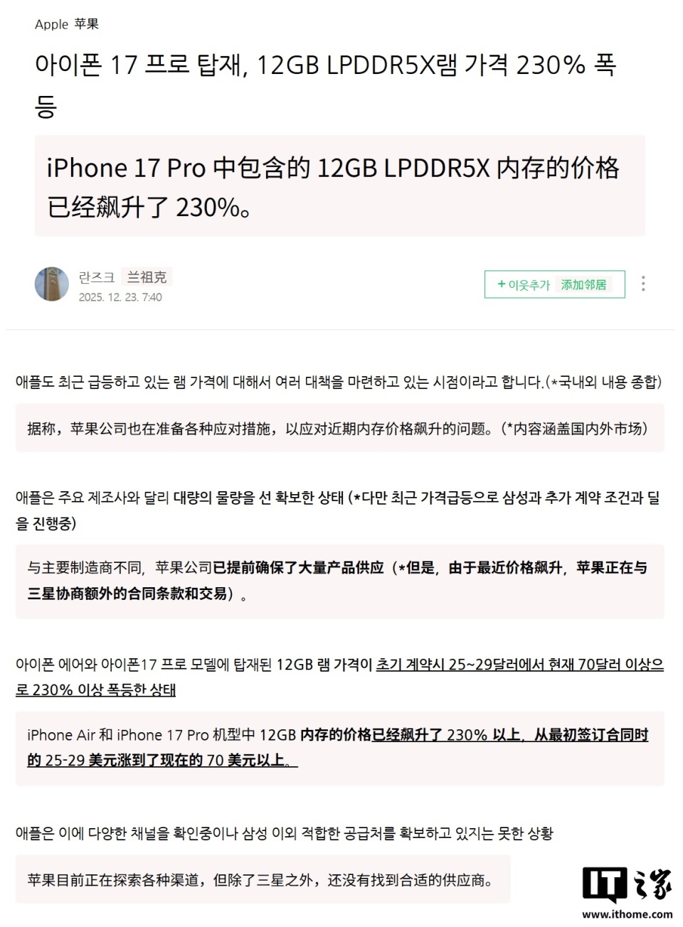 IT之家 12 月 24 日新闻 ,全球 DRAM 供应 链的连续缺乏 ,正在深度磨练苹果的本钱掌握 本事。新闻 源 yeux1122 昨日(12 月 23 日)发布博文,用于 iPhone 17 Pro 系列的 12GB LPDDR5X 内存芯片代价已从 2025 岁首年月