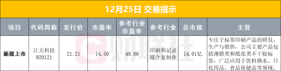 宏观新闻 1、央行等八部分团结公布 《关于金融支持加快西部陆海新通道建立的意见》,《意见》提出21条重点办法,推动发挥好“融资”和“结算”两项金融核心功能,支持西部陆海新通道高质量成长 。《意见》还提出,支持摸索 推动 内地与新加坡数字国民 币跨境支付 试点。 2、外交部谈话 人林剑昨日主持例行记者会。记者提问称,美国贸易代表观察效果称“中国实行了不公正 的步伐,计划主导半导体产业”,美国拟自2027年起对中国半导体产业加征关税。林剑表现,中方坚决反对美方滥施关税、无理打压中国产业。中方催促 美方尽快改正错误做法,以两国元首达成的紧张共鸣 为引领,在平等、恭敬、互惠的底子上,经过过程 对话办理各自关切,妥善管控不合 ,保护 中美关系安定 健康可连续成长 。假如美方一意孤行 ,中方必将坚决接纳响应 步伐,保护 自身合法权益。 3、中国国民 银行货币政策委员会2025年第四序度(总第111次)例会于12月18日召开。集会认为,要继续实行适度宽松的货币政策,加年夜 逆周期和跨周期调理 力度。集会指出,增强对扩展 内需、科技创新、中小微企业等重点领域 的金融支持。集会还指出,用好证券、基金、保险公司互换便当 和股票回购增持再贷款,摸索 常态化的制度安排,保护 资源市场安定 。 4、央行公告,为坚持 银行体系活动性充裕 ,2025年12月25日,中国国民 银行将以固天命 量、利率招标、多重价位中标方法 开展4000亿元MLF操作,期限为1年期。 5、国度 成长 改造 委、商务部公布 《鼓励外商投资产业目次(2025年版)》,经过过程 进一步优化对外商投资的方向性引导,连续提高引天资 量,不断美满外商投资在国内的地域结构。主要变革有:引导外商投资先辈制作 业,引导外商投资当代办事 业等。 行业新闻 1、北京市住房城乡建立委等4部分团结印发《关于进一步优化调解本市房地产相关政策的关照》,自2025年12月24日起施行。此中提出,将非京籍家庭购买五环内商品住房的社保或个税缴纳年限,由现行的“3年”调减为“2年”;购买五环外商品住房的,由现行的“2年”调减为“1年”。此中还提到,商贷利率不再区分首套二套。 2、市场监管总局等部分印发《网售工业产风致量平安 专项治理办法计划 (2025-2027年)》。此中提出,督促收集 交易平台创立 产风致量办理 制度,将产风致量平安 状况纳入合规风险管控清单;鼓励运用 年夜 数据、人工智能等技巧 手段开展日常巡视 ,创立 重点产物价值 信息库,实时排查价值 明显 低于合理区间的产物,对价值 异常、投诉会合的重点产物提高巡视 和抽检频次。 3、昨日, 国投白银LOF、国泰商品LOF、汇添富黄金LOF均公布 公告,将于今日开市起至10:30停牌。 4、河南省国民 当局办公厅克日印发《黄河古都群天下级旅游目的地建立规划(2025—2035年)》。此中提出,到2030年,旅游总收入达到250亿元以上。 5、腾讯元宝公布 的《元宝×DeepSeek年度陈诉》表现,自本年2月接入DeepSeek以来,元宝连续更新DeepSeek的最新模子,用户规模 逐步扩展 ,12月14日当天使用量达到新高,较年初增长超过100倍。 6、江西省国民 当局印发《江西省“人工智能+”办法计划 》。计划 指出,加年夜 具身智能、斲丧电子等领域 传感器研发临盆 ,加快智能穿着、捏造实际等领域 产物创新,支持企业开展光通信 、表现、音视频等模组研发运用 。 公司新闻 1、锋龙股份公告,公司控股股东拟变动为优必选,股票复牌。 2、据接近宁德时代 人士处获悉,宜春时代 新能源矿业有限公司的宜丰县圳口里-奉新县枧下窝锂矿采矿项目,估计 于春节前后复产。 3、凯撒旅业公告,股东金谷信托 拟减持不超3%股份。 4、鲁信创投公告,控股股东鲁信团体拟减持不超1%股份。 5、章源钨业公告,控股股东减持计划实行完成。 6、阳光电源公告,四名股东合计减持42.37万股,此中吴家貌提前终止减持计划且残剩 未减持1200股。 7、三一重能公告,2026年度拟使用不超过95亿元自有资金举办 委托理财。 8、从多个独立 信源相识到,中芯国际已向下旅客 户公布 涨价关照,且此次涨价主要会合于8英寸BCD工艺平台,涨价幅度在10%摆布 。中芯国际方面回应称,对媒体新闻 不做中兴 和评价。 9、安孚科技公告,公司计谋 入股苏州易缆微,标的公司确立了数据中央硅光领域 单波200Gbps、400Gbps光芯片的环球技巧 领先职位。 10、万凯新材公告,控股孙公司与关联 方灵心巧手签署业务条约,向后者供给 人形机器人手臂相关的轻量化零部件等。 11、华秦科技公告,签订2.54亿元航空器机身用特种功能原料 产物条约。 12、胜通能源公告,如未来股票价值 进一步上涨,年夜 概向深圳证券交易所申请停牌核查。 13、合富中国公告,合富喷鼻香 港12月24日减持公司股份9000股。 14、贵州茅台公告,回购股份价值 上限调解为1863.67元/股(含)。 15、联创电子公告,实控人拟变动为江西省国资委,股票今起复牌。 16、恒瑞医药公告,打针 用SHR-A1904纳入冲破 性治疗品种名单,目前环球尚无同类产物获批上市。 17、拓荆科技公告,12月17日至12月24日国度 集成电路基金减持公司总股本的0.65%。 举世市场 美股三年夜 指数集体收涨,均录得日线5连涨。道指涨0.6%,标普500指数涨0.32%,纳指涨0.22%。此中,标普500指数、道指均创历史收盘新高。纳斯达克中国金龙指数收盘微跌0.07%。 国际原油期货结算价微跌。WTI原