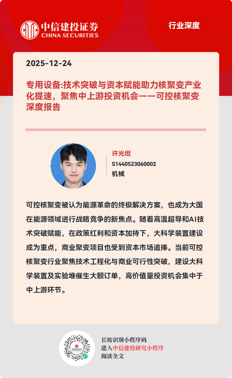 本文转载自微信"大众 ," 号:中信建投证券研究 文|许光坦 乔磊 可控核聚变因燃料富足、清洁 环保、能量密度高且相对平安 等优势,被认为是能源革命的最终 解决 方案,也成为中美欧等地区大国在能源领域举行战略竞争的新焦点。随着高温超导和AI技能突破赋能,政策盈余 和资源加持连续开释,大科学装配 建立成为各国发力重点,贸易聚变项目也受到资源市场追捧。当前可控核聚变行业聚焦技能工程化与贸易可行性突破,建立大科学装配 及实验堆催生大额订单,高代价量投资机会合中于中上游环节。 实现可控核聚变:技能突破引领核聚变走向工程可行性 在举世能源转型和地缘政治不确定性加剧的配景下,可控核聚变以其燃料近乎无限 、零碳排放、较高平安 性等优势,被视为解决 能源缺乏 标题标最终 解决 方案,更是大国战略博弈的必争之地,现已经成为继人工智能革命后,中国、美国和欧洲等地区大国在能源领域举行战略竞争的新标的目的 。比年来新兴技能特殊是高温超导和人工智能等在核聚变项目中的广泛运用 为行业快速迭代注入新的动力,高温超导技能可以有效增强核聚变装配 的磁场强度,在划一聚变功率下减小聚变装配 体积,从而极大降低装配 的制作和运行本钱,加速了核聚变贸易化历程。依赖 高效处置处罚海量实验数据、精准模拟复杂核聚变反响 过程的本事,人工智能技能使得精确掌握 高温等离子体活动成为大概,大幅压缩 了聚变项目标研发周期,降低了迭代本钱。 可控核聚变近况:政策与资源双轮驱动加速财产爆发 人类对可控核聚变的研究始于20世纪50年月 ,至今已有七十余年,依照 研究标的目的 和成长 侧重点划分,当前核聚变财产普遍处于工程突破与贸易化加速阶段。政策助力和资源入局加速了可控核聚变装配 迭代和贸易化历程,激光惯性约束 、磁约束 托卡马克装配 和直线型场反位形装配 等技能门路多头并进,核聚变贸易化路径也逐渐清楚,国际互助 项目与各国当局项目彼此 竞逐,大型国企与贸易聚变公司互为增补,可控核聚变领域正在迎来亘古未有的关注,聚变财产化临界点正在加速到来。政策层面,各国顶层设计明确,制度标准逐步出台;资源层面,随着技能突破与政策利好的双重驱动,可控核聚变领域吸引的大批 资源正推动 聚变技能从实验室向工程验证迈进。中国形成“国家队+民企”互补格局,中核团体和中科院等国家队主导核心系统环节,正在投资超百亿建立大科学装配 并吞 前沿技能困难。民营企业和贸易公司摸索 新型聚变贸易化门路,这种互补格局既保障战略平安 ,又通过市场化机制加速了技能迭代。 投资可控核聚变:聚焦中上游高代价量环节 核聚变财产链分为上游原材料供给 、中游设备 制作 及工程建立、卑鄙核聚变发电及运维三个重要环节,核心目标是实现聚变能贸易化发电或利用聚变副产品举行贸易化变现等。我国在核聚变领域技能积聚深厚 ,通过参与国际互助 项目ITER及自主建立环流三号、EAST、BEST、CRAFT等大科学装配 ,核聚变财产链完整,相干技能位居国际第一梯队,预计2050年前后实现贸易化发电目标。当前阶段使命重如果 摸索 聚变技能门路工程化实践方案及其贸易可行性,大科学装配 及贸易聚变实验堆为中上游环节带来大额订单,因此现在核聚变标的目的 高代价量投资机会重要会合在中上游环节。 投资建议:可控核聚变行业的投资逻辑,正从遥远的“最终 能源”主题叙事,变革为由工程化落地驱动的财产趋向 投资。其核心驱动力源于需求端的爆发 预期与供给端的技能突破,人工智能和大数据财产蓬勃成长 带来的远期供电缺口抵牾日益凸显,高温超导与AI技能在核聚变领域的运用 极大降低了聚变装配 制作本钱、加速了装配 迭代速率,配合 催生了实验堆和示范堆建立的庞大资源开支,为财产链上游材料和中游设备 企业带来了确定性的订单放量。在聚变能源“发出第一度电”之前,为实验堆和示范堆提供核心材料、关键 设备 和系统的中上游企业将率先并连续受益,分享财产从0到1的伟大 增长盈余 。 1)技能研起事 度高,财产化进展周期相对较长,大概影响贸易化进度:可控核聚变需突破等离子体恒久稳固约束 、极端环境材料耐受等多项天下级困难,从实验堆到贸易堆的所需韶光 较长,且任一技能卡点的突破耽误,都大概导致贸易化节点大幅后移,压缩投资回报周期。 2)聚变大装配 高度依赖前期投资,若政策支撑 不足或融资耽误,将使建立历程延后:可控核聚变实验堆或示范堆的前期投资金额伟大 ,需连续投入用于核心部件研发、装配 搭建及团队运维,若当局专项搀扶 资金缩减、税收优惠撤消 ,或市场化融资轮次衔接不畅,将直接导致设备 采购制止 、施工放缓,停滞项目推进节奏。 3)海外公司加速技能突破,大概形成专利封锁:欧美、日本等国的头部聚变企业依赖 先发优势,正加速在超导磁体、等离子体掌握 、能量转化等核心领域的技能攻关与专利布局,若其率先实现关键 突破并构建严密专利网络,将使国内企业面临侵权诉讼、技能规避本钱激增等风险,进一步挤压本土企业的研发与市场成长 空间。 4)贸易化后本钱接纳风险:即便实现技能突破,初期聚变堆运营维护本钱高,若电价缺乏 市场竞争力,大概导致投资回报不及预期,影响资源回见效 率。 许光坦:中信建谋利械首席剖析 师,上海交通