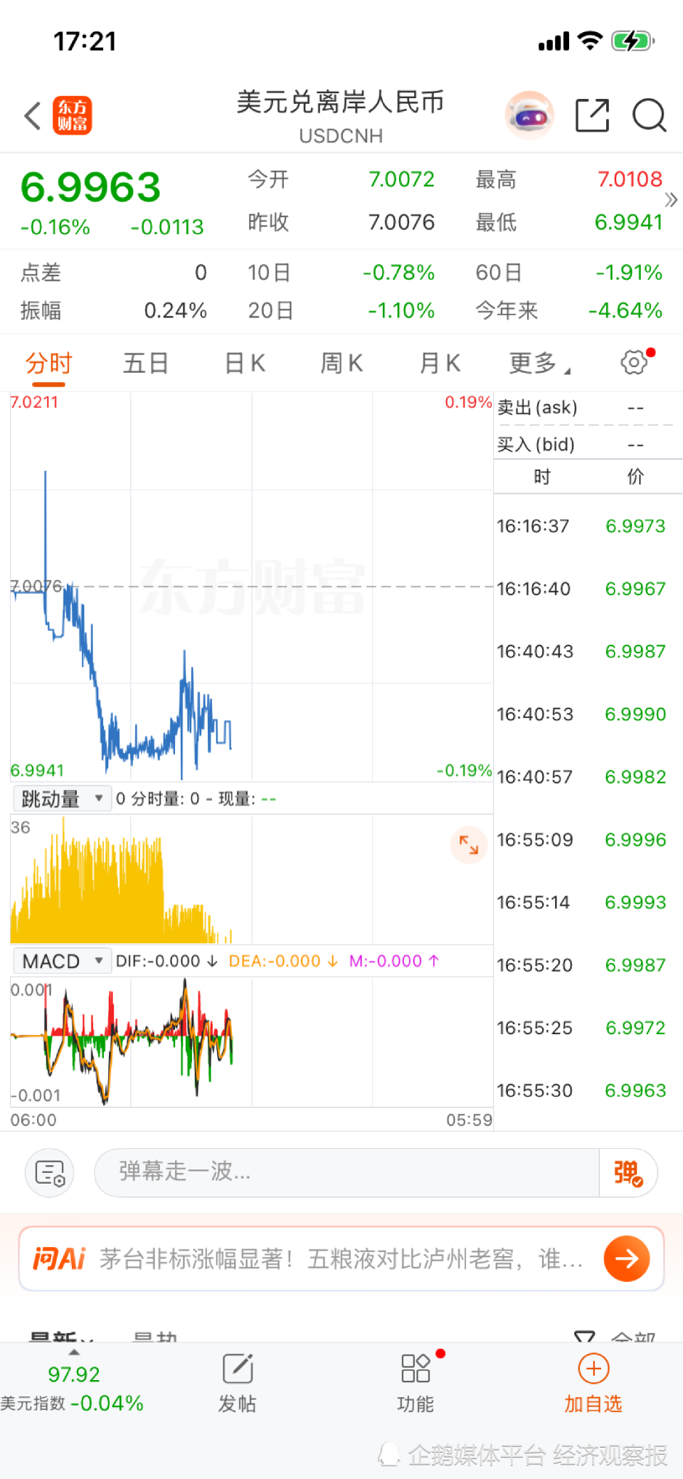 北京时间12月25日11时45分,离岸国民 币对美元汇率报6.9973,较前一生意业务日上涨103个基点,正式升破“7”整数关隘 ,为2024年10月以来初次。12月以来,在岸与离岸国民 币对美元均升值约1.0%,市场普遍认为,国民 币正