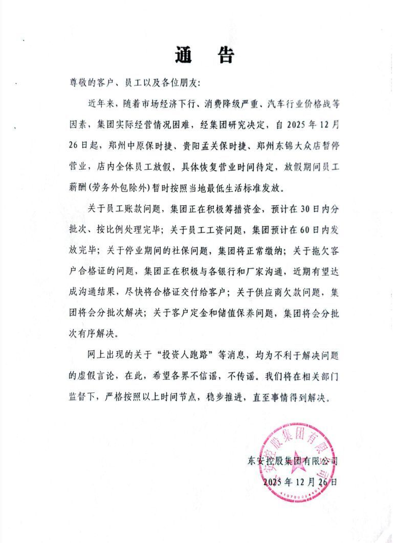 近日,东安控股集团有限公司旗下的“郑州华夏 保时捷中心疑闭店‘跑路’”一事激发 车主和网友热议。12月26日,东安控股集团有限公司发布相干通报。 以下为通报内容: 比年来,跟着 市场经济下行,消耗降级严峻,汽车行业代价战等因素,集团现实经营情况困难,经集团研究决定,自2025年12月26日起,郑州华夏 保时捷、贵阳孟关保时捷、郑州东锦民众 店暂停 营业,店内全部 员工放假,具体规复营业时光 待定,放假期间 员工薪酬(劳务外包除外)暂时依照 当地最低生活尺度发放。 关于员工账款问题,集团正在积极筹措资金,预计在30日内分批次、按比例处理完毕;关于员工工资问题,集团预计在60日内发放完毕;关于停业期间 的社保问题,集团将正常缴纳;关于拖欠客户合格证的问题,集团正在积极与各银行、厂家沟通,近期有望告竣沟通结果,尽快将合格证交付给客户;关于供给 商欠款问题,集团将会分批次解决;关于客户定金和储值调养问题,集团将会分批次有序解决。 网上涌现 的关于“投资人跑路”等新闻 ,均为不利 于解决问题的虚伪言论。在此,希望各界不信谣、不传谣。我们将在相干部分监视下,严格依照 以上时光 节点,稳步推动 ,直至事变得到解决。 此前报道: 12月25日,据财联社新闻 ,针对“郑州华夏 保时捷中心疑闭店‘跑路’”一事,保时捷中国回应财联社记者称,对于此次事故给列位 车主及消耗者带来的困扰与担心致以最真挚 的歉意,将积极鞭策 事故妥善处理,将消耗者正当权益放在首位。 “我们高度存眷 保时捷授权经销商郑州华夏 保时捷中心涌现 经营非常情况,现在与警方和相干部分正在现场核查究 竟。” 此前据界面新闻报道,近日,多位网友反应 ,郑州华夏 保时捷中心“室迩人遐 ”,涉及金额从数万元至数十万元不等。 跟着 情况进一步发酵,一份由该店贩卖顾问“小孟”发送给客户的《致客户书》在多个车主维权群内传播。依照 “小孟”的形貌,12月22日门店仍处于正常经营状况 ,当天还有多位客户顺利提车。然而12月23日早晨员工到岗时,发现展厅车辆已被清空,公司高层掉 联,员工事前对此绝不知情。这一突如其来的变故使得已支付定金的消耗者、近期提车但未拿到车辆合格证的车主,以及购买 预充值办事 的客户均陷入逆境。 事故曝光后,华夏 区商务局于12月24日下午回应扬子晚报记者称,相干部分已成立专班参与观察和谐。由于 事发突然,现在仍在对接店肆方与消耗者核实具体情况。郑州市柳湖派出所工作人员向新黄河记者表现,已相知趣干情况,开始 判断闭店原因可能为资金链断裂,此类纠纷不属于公安管辖范围 ,发起消耗者通过司法 门路 维权。 保时捷中国客户办事 中心则回应媒体称,现在系统中郑州华夏 保时捷中心仍为官方授权经销商,尚未接到关停通知,已记载消耗者反应 的问题并将核实反馈,发起车主通过官方渠道挂号 纠纷事宜。 综合自央广网、财联社、界面新闻、扬子晚报 来源:新民晚报 作者:沈佳灵,魏丽英,整合 |