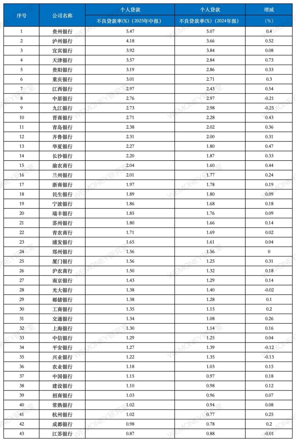 出品|WEMONEY研究室文|王彦强最近,盘了一下43家上市银行的个贷不良率。从数据来看,截至2025年上半岁终 ,只有6家银行的个贷不良率较上岁终 降落,有16家银行的个贷不良率在2%以上,有6家银行冲破 3%。这6家个贷不良率