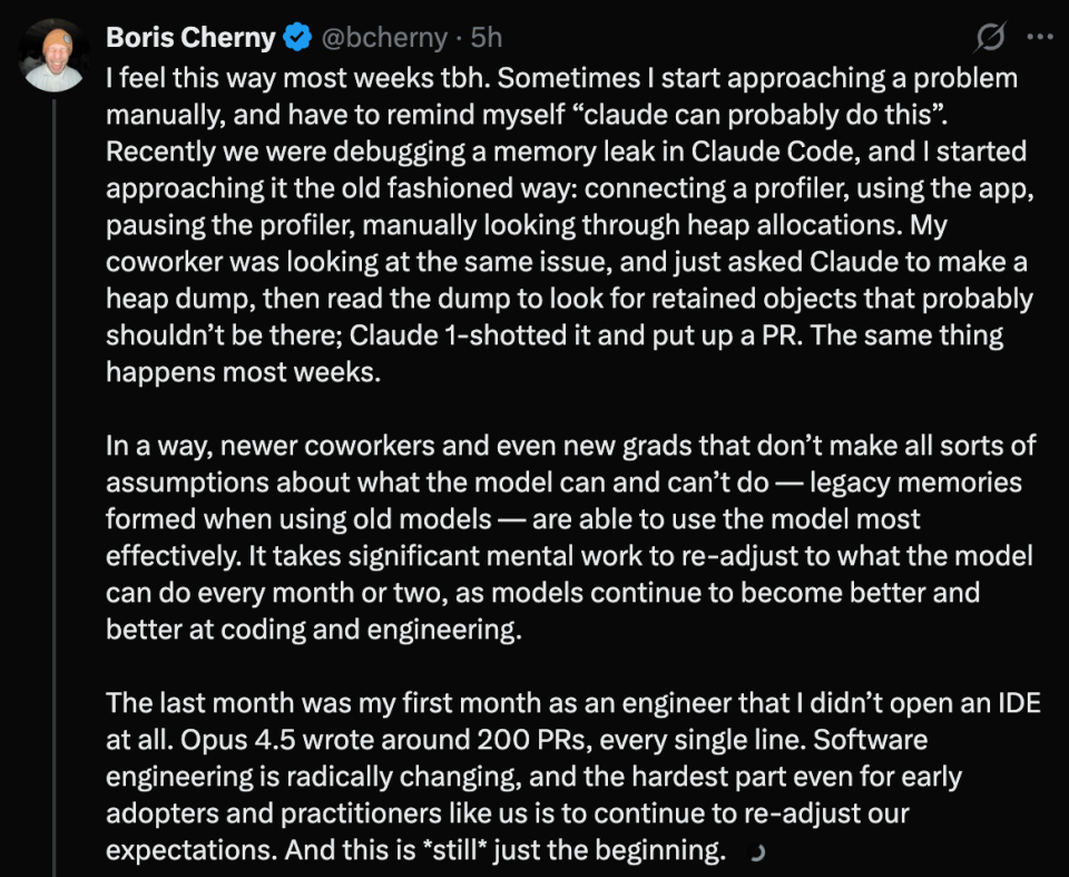 除了卷起袖子积极不落后,别无他法。 Karpathy的这番焦急,立即引爆了评论辩论 。 Claude Code 之父Boris Cherny复兴道,他大年夜 多半 时候也有同感。 Boris坦言,这需要极大年夜 的脑力去适应。有时候他开始手动解决题目,必须强迫本身停下来提示一句:Claude大年夜 概能做这个。 他举了一个迩来的例子:调试Claude Code中的内存泄漏。 老派做法:毗连分析器,使用App,暂停 分析器,手动查看堆分配。 新派做法:Boris的同事在处置惩罚统一 个题目时,直接让Claude天生一个堆转储,然后读取转储文件,探求那些不应存在的滞留对象。 效果?Claude一次搞定,并直接提交了PR。 Boris指出,这种事变每周都在发生。 有趣的是,在这个新时代,刚结业的大年夜 弟子乃至比熟手在行 更有屈服 。由于他们没有关于“模型能做什么、不能做什么”的陈旧假设。而熟手在行 们每隔一两个月就要重新调整预期,这异常 斲丧心力。 紧接着,Boris抛出了一个更惊人的数据: 上个月是他作为工程师的第一个月,完备 没有打开过IDE。 Opus 4.5写了大年夜 约200个PR,每一行代码都是它写的。 软件工程正在发生根天性的变革,纵然对于早期接纳者和从业者来说,最难的部分也是不停重新调整预期。 而这,仅仅是个开始。 假如不握好这把枪,你就out了。 对于Boris的履历,Karpathy表示完备 感同身受。 他连续了“外星对象 ”的比喻: 你拿着这个东西 到处指,有时它只射出几颗小弹丸,有时乃至会走火。 但偶尔,当你握持姿势恰到好处时,它会喷射出一道强盛年夜 的激光束,瞬间熔化 你的题目。 在评论辩论 的末了,Karpathy给全部步伐员敲响了警钟: 那些在过去30天里没有跟上节奏 的人,在这个话题上的世界观已经过 时了。 --end-- |