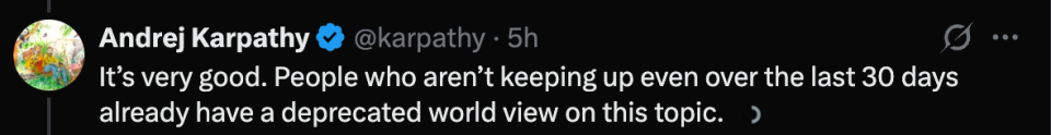AI大年夜 神Andrej Karpathy,哪怕是他,现在也感到焦急了。就在刚刚,这位前OpenAI连合首创人、前特斯拉AI总监发出感慨 :作为一名步伐员,我从未像现在如许感到云云落后。Karpathy直言,步伐员这个职业正在履历一场
