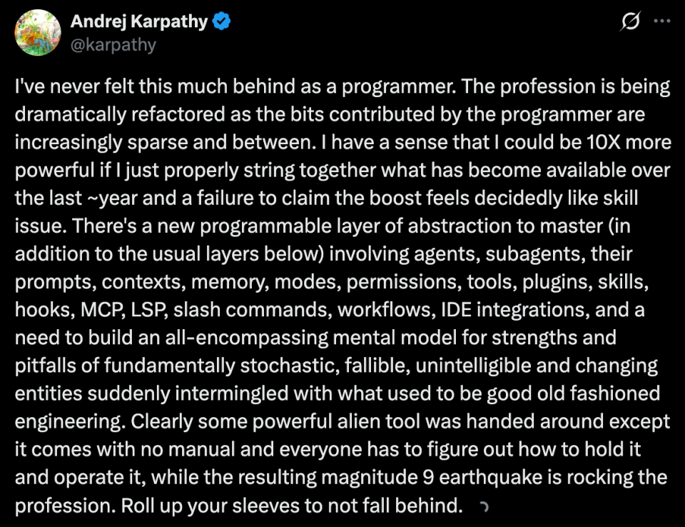 AI大年夜 神Andrej Karpathy,哪怕是他,现在也感到焦急了。 就在刚刚,这位前OpenAI连合首创人、前特斯拉AI总监发出感慨 :作为一名步伐员,我从未像现在如许感到云云落后。 Karpathy直言,步伐员这个职业正在履历一场激烈 的重构。人类步伐员贡献的“比特”变得越来越稀疏。 他乃至发生 了一种感到 :假如能把过去一年涌现出的对象 正确串联起来,本身的战役 力本可以提升10倍。而没能做到这一点,让他觉得这纯洁 是技能题目。 这背后,是一层全新的、需要把握的抽象层。 除了传统的底层技能,现在还要面对Agent(智能体)、Subagent(子智能体)、Prompt(提示词)、Context(高低 文)、Memory(记忆 )、Tools(对象 )、MCP、LSP、IDE集成等等。 我们需要为这些实质 上随机、易错、不可理解且不停变革的实体,创建一个包含 万象的心智模型,并将其与老派的传统工程结合起来。 Karpathy打了一个比方: