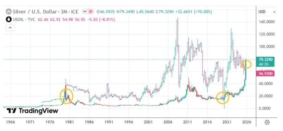 每经编纂 :毕陆名在近期暴涨后,现货白银价格已升至每盎司79.19美元;与此同时,美国WTI原油期货价格收于每桶56.74美元。 这意味着,一盎司白银的价格已凌驾一桶美国原油——上一次出现这一情形还是在2020年4月份,