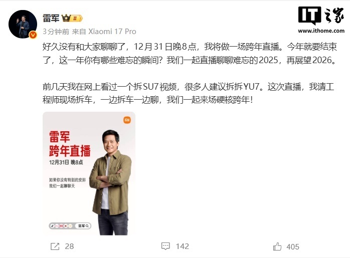 IT之家 12 月 30 日新闻 ,小米开办人、董事长兼 CEO 雷军本日发布微博称,12 月 31 日晚 8 点,将做一场跨年直播,请工程师现场拆车。雷军称,“很久没有和各人聊聊了,12 月 31 日晚 8 点,我将做一场跨年直播。本