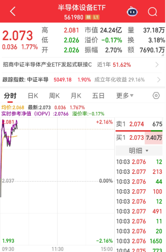 隔断元旦仅剩1个生意业务日,本日 存储芯片再度爆发,带动上游设备 同步走强。热门半导体设备 ETF(561980)本日 年夜 幅高开2%、如今上涨1.77%,连续3个生意业务日获资金净流入超5500万元。成份股方面,北方华创、长川科