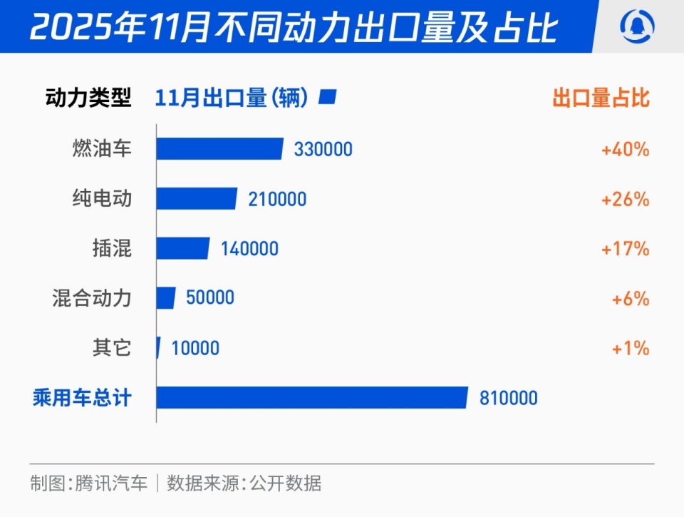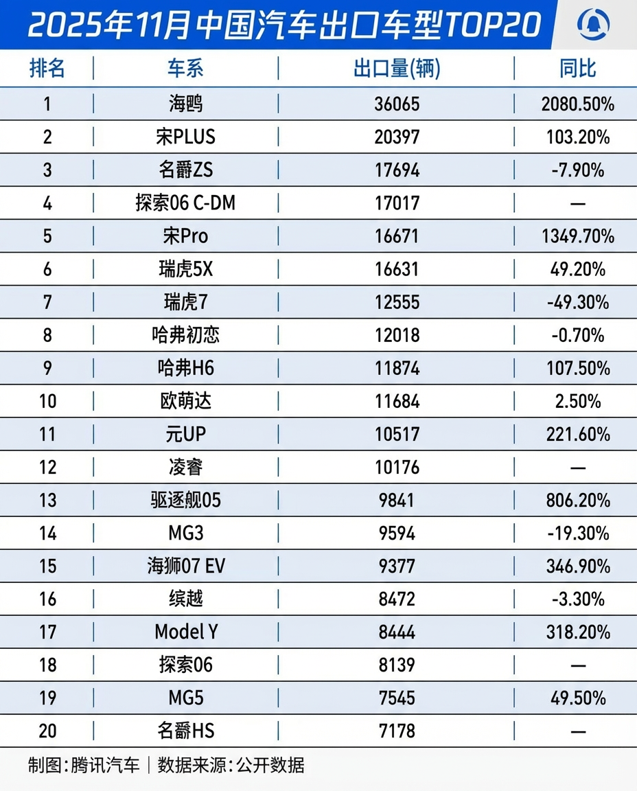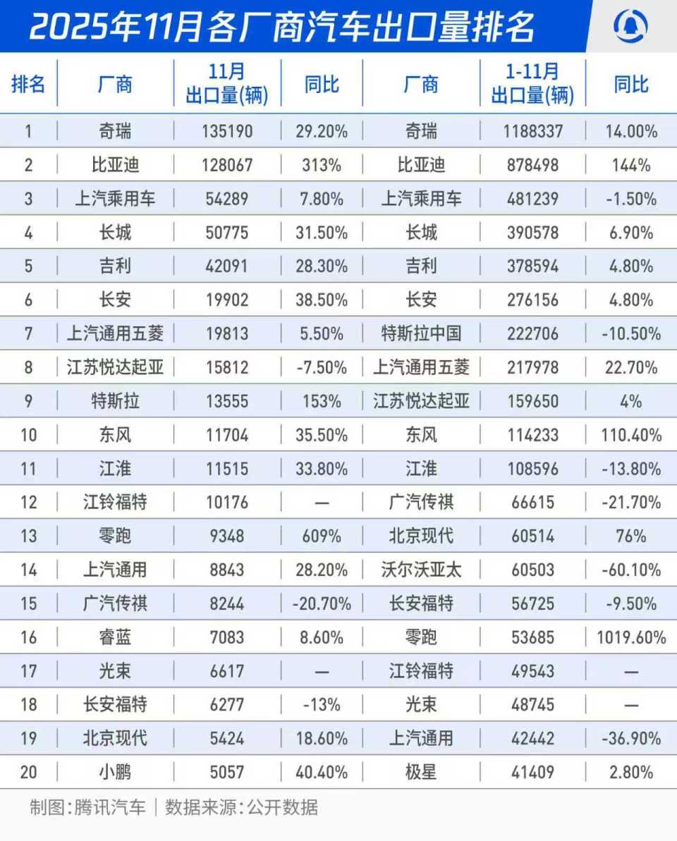 编者按:以定力致远,以重构图新。驾仕派、大象新闻 、大象财产团结腾讯新闻 、腾讯汽车推出2025岁终 筹谋《定力与重构》,回望2025、预测2026,让洞察照见本色 ,向变革 寻求必定 。 文|驾仕派 编辑|杨布丁 史晓龙 12月初,一则简朴的海关数据引人关注:2025年前11个月,中国贸易顺差达到 了惊人的77081.19亿元,约合1.076万亿美元。至此,中国成为了全球第一个贸易顺差超过万亿的国家 。 在2025年中国的出口商品中,汽车,显然是今年的亮点之一。 同样根据海关的统计快报体现,1-11月中国出口汽车(含底盘)达到 了733.1万辆(套),同比增长25.7%,出口汽车(含底盘)金额高达1253.16亿美元,占到出口总额的3.67%。 这还不包括871.43亿美元的汽车零配件,加在一路 中国汽车产业的出口规模可以达到 2124亿美元,几乎 占到了全球汽车出口市场的18%摆布 ,与中国全球最大汽车出口国的地位匹配。 如果仅以整车出口来看,中国汽车工业协会给出的数据,11月汽车出口72.8万辆、同比增长48.5%,当月出口量为汗青上首次超过70万辆,这也使得1-11月汽车出口达到 634.3万辆、同比增长18.7%。 如无不测,到2025年结束,中国汽车整车出口量会比日本汽车的出口总量多出75%。 如果把时钟回拨20年,2005年,中国汽车整年产量也仅为570.77万辆。到了2006年,中国汽车产销同比增长超过25%,销量达到 720万辆的规模,那一年中国汽车国内销量首次超过了日本国内销量,成为仅次于美国市场的全球第二大汽车销量国。 从2009年开始,中国国内汽车销量就超越 了美国,成为了全球第一大汽车消费国。之后很长一段时光 ,中国汽车市场都是以内需驱动的地区市场,直到2023年,中国汽车产业以491万辆的出口规模,逾次日 本本土车企的出口量,成为了全球第一大汽车出口国。 站在2025年的年尾,中国汽车的出口量正向着800万辆出口规模迈进。这也意味着中国汽车的出口量已经可以支撑 车企面向差别地区市场做新产品导入——因为 已经有足够的规模效应可以支撑 海外车型的开发。 在中国汽车内卷的背景之下,走出国门去寻找盈利时机和销量增长空间,成为大部分中国品牌的选择,而欧洲、东南亚、拉丁美洲这些空白 市场也成为了中国车企新的“决胜之地”。 中国汽车出海以新能源车打头阵,向更广阔 的山和大海走去。 中国汽车出口连续增长,比亚迪是最强引擎 跟着 国内新能源市场的发作,中国汽车出口从2021年开始,进入了急速膨胀的增长期,之后在2023年一举超越 德国、日本,成为全球第一大汽车出口国。 到了今年前11个月,中国汽车总出口量已经达到 733万辆,其中 乘用车出口量达到 623万辆,几乎 为日本、德国的出口量总和,而跟着 时光 的推移,中国的汽车出口业务 ,还将坚持 相称长时光 的增长期。 上表是各在华厂商的出口量数据,先看11月份,出口业务 处于第一梯队的有两家,分别 是奇瑞和比亚迪,单月出口量分别 达到 13.5万和12.8万辆,规模远远超过其余 厂商。 能归到第二梯队的,也只有长城和吉祥两家,11月分别 出口5.08万和4.21万辆。再往下的话,从排名第6的长安到排名第12的江铃福特,单月出口量都处于1-2万辆之间。 前十一个月的累计销量,奇瑞以118.8万辆的规模稳居第一,相较第二名比亚迪多了30多万辆,是如今独一 年度出口量超百万辆的车企。但增长率层面最亮眼的,无疑是比亚迪,11月出口量同比激增3.1倍,前11个月累计销量增幅也高达1.4倍,是中国汽车出口业务 最焦点的增长引擎。按照这个趋势,比亚迪2026年有极大概率能超越 奇瑞,成为中国最大汽车出口车企。 车型方面,我们就聚焦最近11月份的数据: 如上表,11月份出口量最高的20款车型,有6款车型来自比亚迪,是上榜车型最多的厂商,且比亚迪海鸥和宋PLUS,分别 占领 了榜单冠亚军。 在国内市场,比亚迪海鸥近几个月的销量都明显 不及吉祥星愿,但其单月出口量高达3.6万辆,已经超过了当月在国内的规模。宋PLUS的环境也比较相似,这款车如今在国内市场的定位基本 被海狮05代替,11月上险量只有不够 8千辆,而其出口量却超过2万辆,其焦点市场也完成了从国内向海外的变化。 除此之外,排名靠前的名爵ZS、摸索 06、瑞虎5X、哈弗初恋等车型,也都是雷同的环境。由此我们也可以看出,国内车市和汽车出口业务 ,是完整 差别的两种生态,许多在国内的滞销车型,恰好是海外市场的喷鼻 饽饽。 接下来我们再看看产自中国的汽车,都被销往了哪些海外市场。 中国年出口量还倘佯在100万辆摆布 的2019年,中国汽车重要出口目标地,除了排名第9的美国外,其余基本 都是发展中国家 ,包括人均GDP相对落后的孟加拉和印度,在2019年曾分列第一和第三名。 跟着 中国出口业务 快速增长,到了2022年,孟加拉、印度、秘鲁、美首都 依次失落 出Top 10,比利时、澳大利亚、英国等发达国家 的排名显著提拔。 一个对于中国汽车出口非常症结 的迁徙变化点,是2023年,俄罗斯首次成为中国第一大汽车出口目标地,背后的原因则有很强的地缘政治影响。 2021年之前,中国向海外出口的汽车,主如果 价值 相对低廉的燃油车,目标地也以发展中国家 为主。而到最近几个月,新能源车出口量的占比已经和燃油车持平。 今年11月份,中国总计出口81万辆汽车,其中 33万辆是纯燃油车,占比40%,纯电和PHEV插混出口量分别 为21万和14万辆,分别 占比26%和17%。 燃油车的重要出口目标地,全体 都是发展中国家 ,排名最靠前