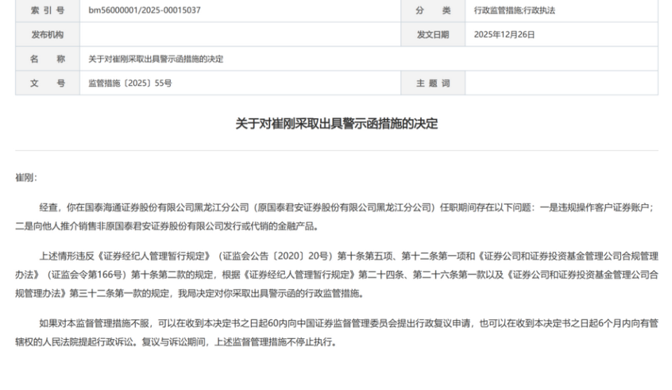 财联社12月30日讯(记者 陈俊兰)监管部分对券商及从业职员的违规运动管控力度正日益趋严。易董数据表现,今年以来监管部分累计开出券商罚单343张,此中多起还涉及“双罚”。 从现有违规事由剖析 ,内部掌握 与合规管理仍是多家分支机构的单薄环节。详细表现为:在掮客 业务 领域,从业职员违规生意业务股票、投资顾问 运动失落 当、投资者适当性管理落实不到位等问题较为突出;在投行业务 方面,未勤恳 推行信息披露督导任务的情况亦屡被说起 。 值得一提的是,产物销售环节的“飞单”运动,以及在销售环节中的投资者适当性管理不到位,也是屡见不鲜的遭罚案例,且从今年内的违规案例看,违规主体已有从个人向机构化延长 的特征,至少已有5家券商分支机构是以 接到7张罚单。 年内多起“飞单”致业务部、个人双罚 2025年以来,证券行业“飞单”问题连续成为监管重点,多地证监局密集开出罚单,对涉事券商分支机构及其相干任务 职员同步追责,“机构+个人”双罚特征尤为突出。 最新的案例则来自国泰海通证券黑龙江分公司(原国泰君安证券黑龙江分公司)。12月26日,黑龙江证监局宣布 通告称,国泰海通证券黑龙江分公司员工崔刚任职期间存在以下问题:一是违规操作客户证券账户;二是向他人推介销售非原国泰君安证券发行或代销的金融产物。 根据相干规定 ,黑龙江证监局决定对崔刚采掏出 具警示函的行政监管步伐,并记入证券期货市场诚信档案。中证协表现崔刚于2012年1月6日在国泰海通证券挂号 的执业岗位 为证券投资咨询,目前的挂号 状态为正常。 同日,黑龙江证监局还对国泰海通证券黑龙江分公司及其时任负责人开出其余 两张罚单,涉及员工违规生意业务证券、违规操作客户账户及内部管理失落 职等问题。 梳理发明 年内已有多家券商分支机构因“飞单”领罚单。11月14日,广发证券杭州富春路证券业务部员工沈宇在从业期间,存在向他人推介销售非公司发行或代销的金融产物并从中获取不正当利益的运动,收到浙江证监局罚单。 10月24日,渤海证券广顺北大街业务部存在个别员工向客户销售非业务部代销的私募基金产物等问题,业务部与直接负责人方健一同被北京监管局出具警示函。 天风证券年内多次因“飞单”被点名。8月26日,天风证券潍坊东峰街业务部员工私下推荐非本公司代销私募基金,山东证监局责令业务部及负责人纪昌纠正 ;7月25日,天风证券重庆庆云路国金中心业务部员工廖禄林担当外部公司理 财司理并销售非天风产物,被重庆证监局出具警示函。 6月13日,江海证券牡丹江绥芬河文化街业务部因未能实时发明 员工郑彩芳销售非公司代销产物且未妥当 处置惩罚投资者投诉,被黑龙江证监局对业务部及员工双双出具警示函。 谨防受到“飞单”销售陵犯 证券公司分支机构员工私下向客户推荐、销售未经内部审批备案的金融产物,这一运动被称为“飞单”的违规运动,正连续激发 行业与监管存眷 。该运动不但直接违背监管规定 ,更给投资者与机构带来三重显著风险,包含 产物天资 缺失落 、销售环节隐患突出以及内部监控失落 效等。 从风险结构看,“飞单”产物往往由非正规金融机构发行,未经证券公司严酷的委托人检察、尽调及风险评估流程,管理天资 、资金投向与风险特征模糊,潜藏较高信用与运动性风险,易导致投资者重大丧失落 。别的,这类产物信息披露多依赖非官方渠道,销售职员把握信息不完整 且难以验证,在推介进程 中易涌现 虚伪宣传、隐瞒风险等问题,进一步加剧投资风险。更值得存眷 的是,“飞单”销售完整 脱离证券公司统一 管理系统 ,致使销售进程 、适当性管理与资金流向处于监控真空,既袭击 机构内控有效性,也抬升行业整体合规风险。 对于投资者怎样辨认与防范“飞单”陷阱,湘财证券给出四方面详细发起: