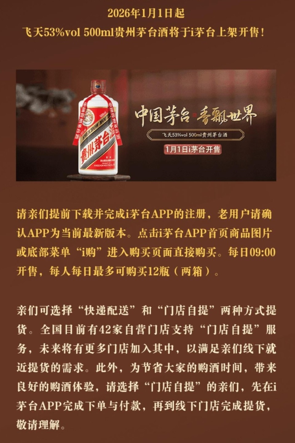 2026年1月1日,贵州茅台首次把53度500ml飞天茅台搬上i茅台APP,定价1499元/瓶。9时整,平台进行第一拨产品投放,一开售即宣布 售罄。 这是茅台自2022年推出i茅台平台以来,首次将焦点大单品飞天茅台纳入直销体系 ,每