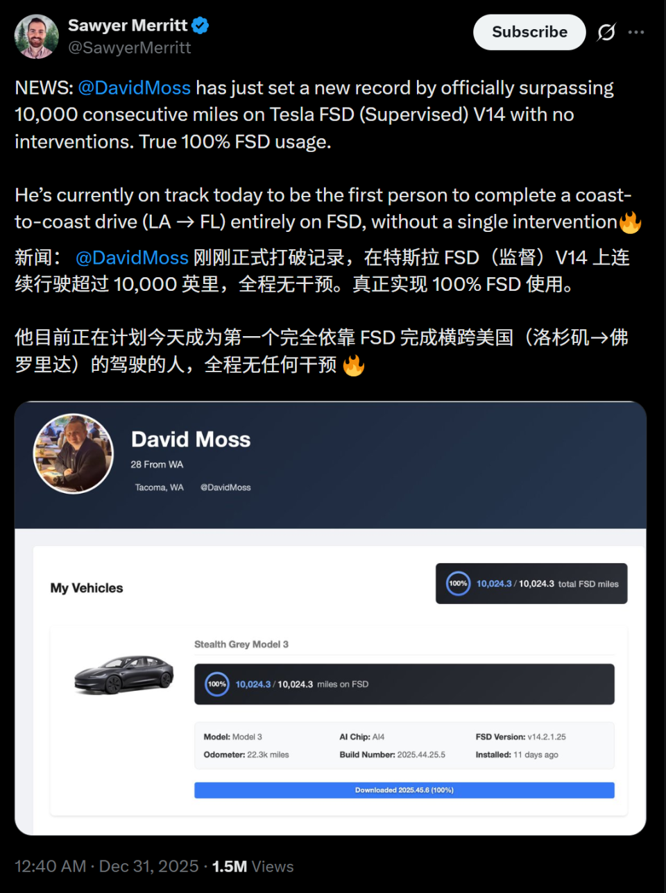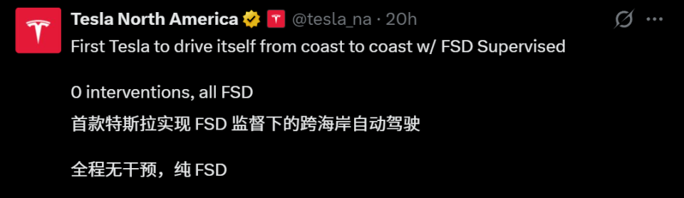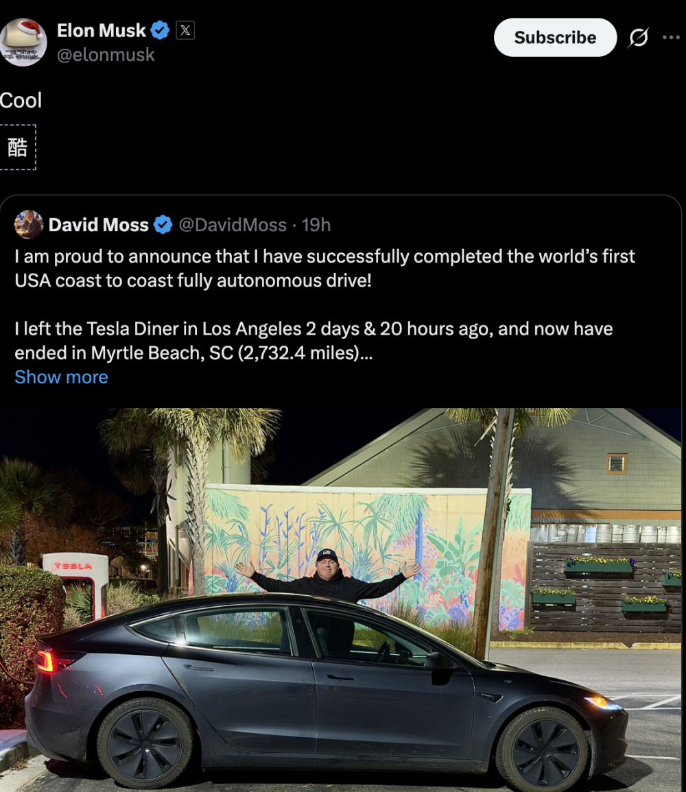 新智元报道 编辑:Aeneas KingHZ 【新智元导读】2026年第一天,自动驾驶迎来历史时光 ——特斯拉FSD完成人类初次「零接受」横穿美国!举世科技圈都被引爆了,马斯克端到端自动驾驶彻底告成 。标的目的 盘,可以退出历史舞台了? 刚刚 ,特斯拉FSD,完成举世首个完整 自动驾驶的横穿美国。 从今天起,人类的自动驾驶,达到 了全新的里程碑! 就在2025年的最后一天,当全世界都在预备倒数跨年时,车主David Moss静悄悄地扔出了一枚深水炸弹—— 他驾驶搭载FSD V14.2的Model 3,完成了举世初次、经由第三方数据验证的「零接受」横贯美国之旅。 从美国西海岸开到东海岸,2天20小时,人类0次接受。 物理世界的「自动驾驶奇点」,终于降临! 这条推特,也彻底引爆了举世科技圈和AI圈。 由此,他也成为全世界第一个全程凭借自动驾驶横穿美国的人。 可以说,这是特斯拉正式经由历程 了公路上的图灵测试。 这场AI主导的公路不雅 光,直接震惊 了举世特斯拉车主。 前特斯拉AI总监Karpathy高兴高呼:这一刻终于来了,这是端到端神经收集 的告成 ,这是「软件2.0」在物理世界的完整 接受,不再必要人类写下的规则! 特斯拉官方账号,表彰了此次 壮举。 一位特斯拉车主赞叹:「我们已步入自动驾驶穿越美洲大陆的时代 。」 特斯拉掌门人马斯克,也冲动转发莫斯的推文:「酷!」 十年前,马斯克许下「Coast-to-Coast」的信誉,2026年1月1日,终于实现了! 大概真如Karpathy所说:从此,标的目的 盘只是车上的一个装饰品? 举世初次 人类零接受 下面这份数据,让人难以克制心头的震惊 。