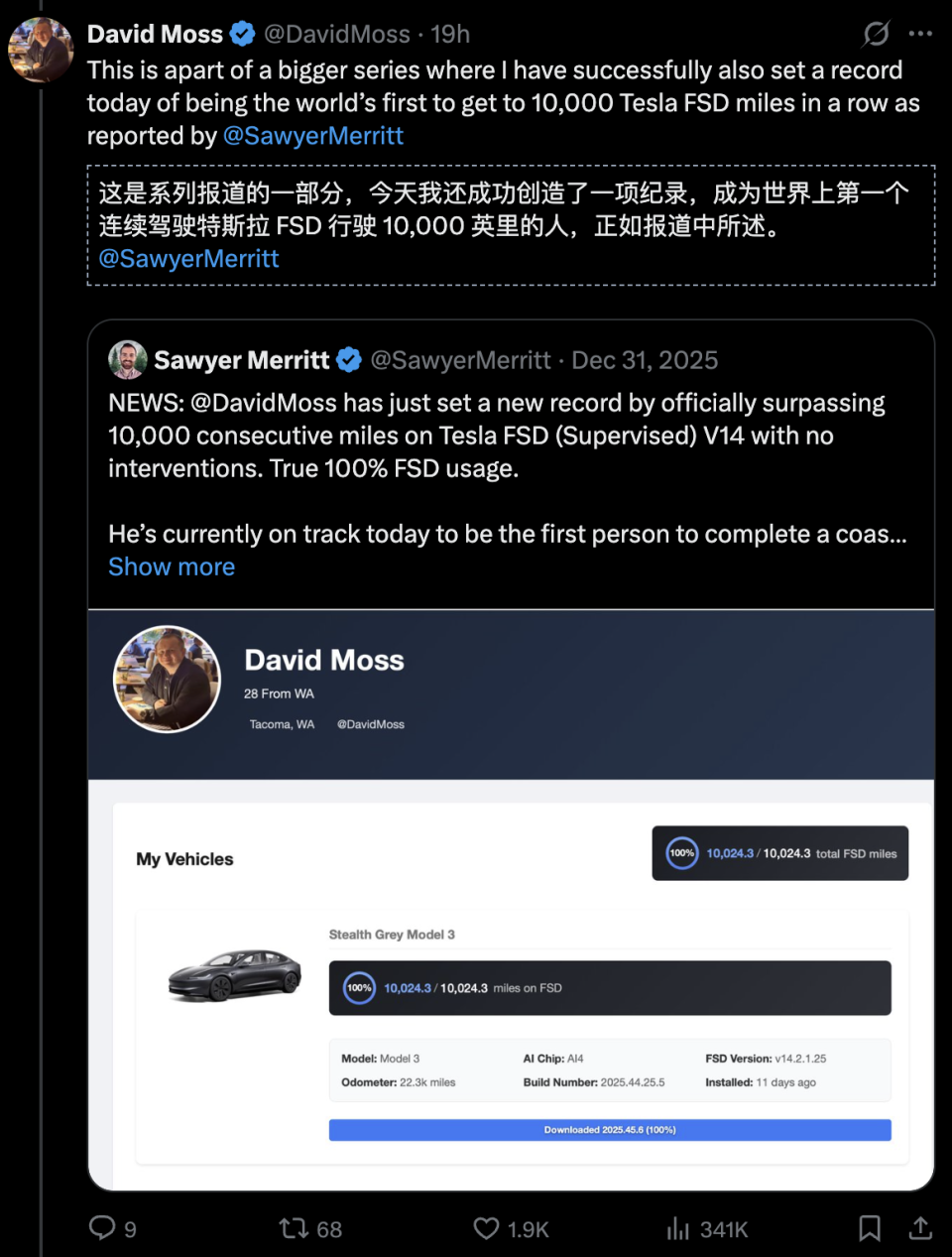 当特斯拉从v12开端 抛弃传统的C++,转向端到端神经收集 ,AI就从数百万小时的视频中,真正学会了开车。 在这场高出美国大陆的旅途中,David Moss没有任何一刻,触摸车里的标的目的 盘,大概踩过踏板! 想象一下:坐在驾驶座上,盯着标的目的 盘整整68个小时(2天20小时),看着它自行迁徙转变 ,穿过繁忙的洛杉矶街道,汇入州际高速,避让加州的摩托车手,在德克萨斯的暴雨中稳住车身,最后停在南卡罗来纳州的海滩边。 他从洛杉矶的特斯拉餐厅出发,最终达到 南卡罗来纳州默特尔海滩,穿越了24个州。 假如你亲身开过这段行程,就会明白全程的路况有多么庞杂 。然而从加州的高速公路,到中部的都会街道,再到东海岸的庞杂 路况,FSD一次性全体 搞定了! 天气多变,交通拥挤,甚至夜间驾驶、自动化充电,都没让系统 掉链子。 Moss评价说——全部 历程 中,从未出现 过一次险情,即使 在人类驾驶员中,这也实属稀有。 对于好奇的网友,Moss表示,你可以登录FSD数据库,验证所稀有 据。 同时,David Moss晒出了充电记载。留意,在全部站点的泊车 ,也都是由特斯拉FSD自动完成的。 此次 横穿美国大陆,不仅体现了FSD V14.2的技巧 能力,也向全部 行业证明—— 即使 在现实的庞杂 场景,L4自动驾驶也有可能实现! 十几年前,如许的壮举还只是工程师的技巧 空想。 从2016年,特斯拉的FSD系统 就开端 宣传「零干涉 横贯美国」的目标。 在公布 Autopilot 2.0时,Elon Musk就放话,说2017岁尾 就能实现。 这是一个迟到了八年的答应,但当它终于兑现时,仍旧让人感到吃惊! 一位特斯拉FSD的逝世 忠粉 其着实25岁尾 ,David Moss就曾创下纪录。 其时,他在特斯拉FSD V14上,连续驾驶了凌驾10000英里,且全程无干涉 ,实现了真正的100%自动驾驶。 其时的路线图是如许的。 而这个消息 出来后,网友们纷纷表示,不成 能,这毫不 可能! 有人说,自己天天都在用FSD 14.2.2.1,虽然 体验很棒,但毫不 可能实现完整 自动驾驶。 然而David Moss晒出的仪表盘显示,FSD V14确实 不移完成了100%的完整 自动驾驶。 在去年 龄尾 ,他就立下雄心:成为第一个完整 依赖FSD用自动驾驶高出美国(洛杉矶→佛罗里达)的人。 时隔一年,他果真 完成了这个目标,实现了一个更宏大的路线图。 这完整 出于他对驾驶的热爱 ,并不是为了炒作。 马斯克:谁人「该死 的」2017 预言 回到2016年10月。 彼时,马斯克意气风发,豪言:「到2017岁尾 ,特斯拉将能够从洛杉矶自动驾驶到纽约,全程哪怕你碰一下标的目的 盘都算我输。」 后来的故事我们都知道了。 2017年过去了,2020年过去了,甚至到了2024年,马斯克不停跳票! 这个答应就像是一个「永世的来岁」。 由于 技巧 路线的反复横跳(从雷达+视觉到纯视觉,从规则代码到神经收集 ),特斯拉的自动驾驶曾一度陷入瓶颈,甚至被谷歌旗下的Waymo在无人出租车领域抢尽风头。 Gemini生成的特斯拉自动驾驶技巧 路线图 直到FSD V12 版本的出现 ,特斯拉彻底抛弃了本来 的代码逻辑,转向了「端到端」神经收集 。 简朴说,就是让AI像人类一样,直接经由历程 看视频学会开车,而不是由工程师一行行写代码告知 它「红灯停、绿灯行」。 尽管特斯拉坚信端到端神经收集 技巧 ,但这绝非自动驾驶领域的共识方案。 大多半 其他自动驾驶研发公司都采取传感器麋集型、模块化的驾驶方法 。虽然 这类系统 在初期开发和调试可能更容易,但其庞杂 性也不容忽视 。 特斯拉AI负责人Ashok Elluswam,在国际盘算机视觉大会ICCV介绍了端到端方案的上风:
