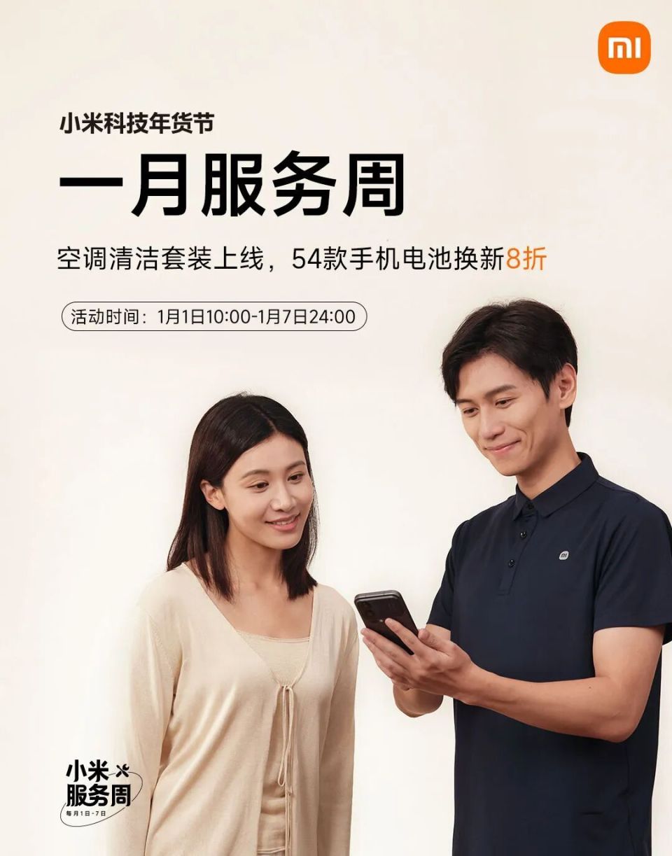 来了来了,一个月一次的小米服务周活动,终于又开始 了。今天早上,阿米官宣 2026 年 1 月服务周正式上线。活动内容方面,除了换电池 8 折、电脑清洁 5 折、99 元家电清洁经典三件套外,这次还新增了一个空调清洁套装