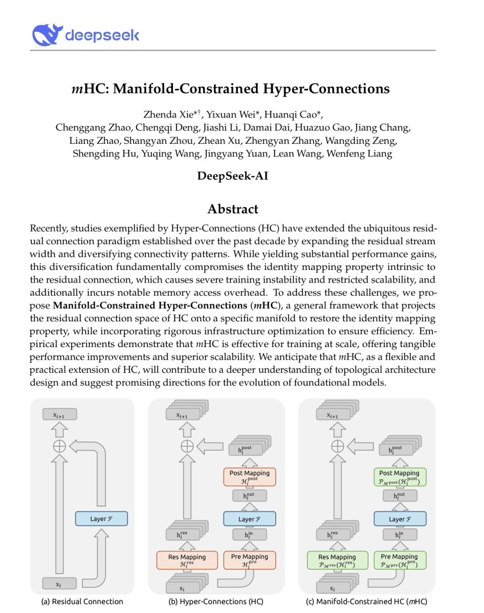 1月1日新闻 ,DeepSeek赶在新年前发送了“贺礼”,在新论文中提出了名为mHC(流形约束超毗连)的新收集 架构,旨在解决传统架构在年夜 规模模型练习中的不稳固性问题,这一研究 或将为下一代根本架构的演进指明新标的目