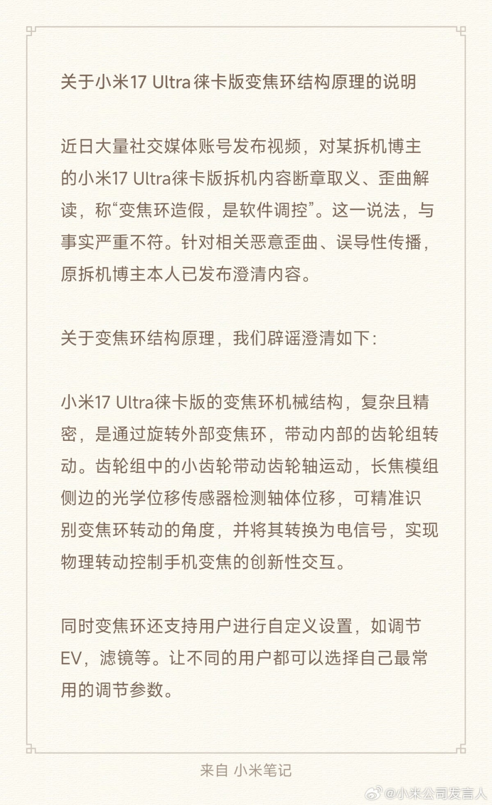 这事儿发酵得比较快,小米没过多久就发了官方回应。比如说清楚了小米17 Ultra徕卡版的变焦环是有机械结构的,是经由过程