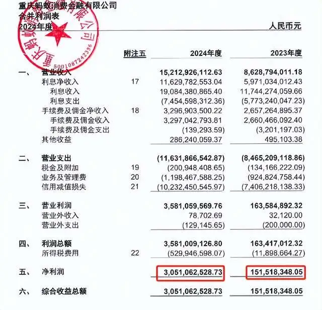 4月22日,重庆蚂蚁消耗金融有限公司(简称“蚂蚁消金”)发布2024年年报。资产总额达3137.51亿元,负债 总额达2877.48亿元,所有者权益总额260.03亿元。值得一提是净利润达到了30.51亿元,较2023年的1.51亿元,增加 了