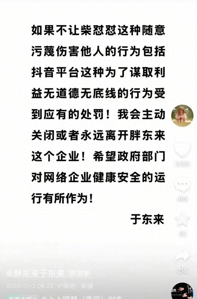 5月3日,胖东来首创人于东来发文,如果不让柴怼怼这种随便污蔑伤害他人的活动受到应有的处分 ,他将主动封闭 胖东来或者永阔别开胖东来这个企业。可以看得出来,于东来是怀着非常 末路 怒 的心情 公布 这一条信息。而统一 天