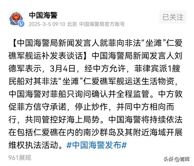 3月4号当天,菲律宾武装部队组织相关人员利用一艘民用船只进入我国仁爱礁海域,对那艘登陆舰进行补给。随后菲律宾媒体对外发布了相关的现场画面,这也是自上个月28号我们发现马德雷山号登陆舰上燃起滚滚浓烟之后所看