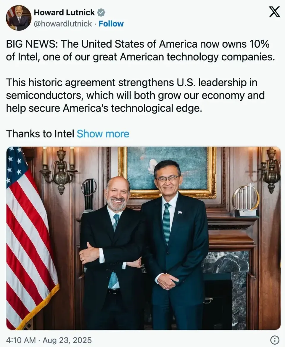 如今这个买卖业务有眉目了: 美国政府将利用《芯片法案》尚未拨付的57亿美元补助资金,以及“平安 飞地”芯片筹划授予英特尔的32亿美元资金,购置 4.333亿股英特尔普通股,占英特尔10%的股份。 作为协议 的一部分,美国政府还将获得一份为期五年的认股权证,可按每股20美元的代价再认购5%的英特尔普通股。 翻译成人话,就是美国政府一分钱没掏,而是通过“贴息贷款”的方式,强行拿下英特尔10%的股份。 ![]() 特朗普在社交媒体上发帖称,该协议 “对美国而言是一笔巨大买卖业务,对英特尔而言同样也是一笔巨大买卖业务”。 这是一笔什么买卖业务呢? “只要国家有需要,英特尔随时上交国家”。 如果这一幕发生在中国,就相称于中国政府强行入股阿里巴巴或者腾讯10%的股份。 敢问各位 怎么想?媒体会怎么说?资源会怎么不雅 望? 也许 率就是:私企完了;毒害企业家;营商环境恶劣…… 固然,老美做事也许 也有他的情由 ,也许 ,这就是将凯恩斯主义的普遍真理同美国的详细实际联合起来,大力推进公有制经济改造 ,建设有美国特色 的资源主义社会,为周全 建设资源主义当代化国家、周全 推进MAGA而团结奋斗。 ![]() 收购英特尔,强吃英伟达15%的利润,同时钳制 台积电把技能和工场 留在美国。 通过这种强行国有化的方式,来实现对全球半导体财产链的把持把握 。 这一系列的动作,都在公布 美国正进入“国家资源主义“——企业必需 听特朗普批示 ,不然 就干死企业。 “国进平易近 退”、“寡头经济”、“财产补贴不尊重市场规律”…… 如今这些词,已经可以无缝套在美国头上。 更要命的是,美国如今干预企业,都没有什么法律和制度的配套。 一条社交媒体上的推文、一条“总统行政令”、甚至特朗普的一个德律风 ,就可以代替法律,连一张A4纸都不需要。 近来传出特朗普又准备入股三星,韩国那边表现很慌。 至于印度,由于被加征了50%的关税,直接把特朗普的泥像 弄出来游行示众。 ![]() 全世界已经看不懂特朗普,但美国人是懂特朗普的,他背负骂名,只为让美国再次巨大。 为了实现这个目标,他先选择让一部分美国人先强大起来。 但让美国人再次强大很难,以是先选择让一部分美国政府构造先强大起来。 让美国构造再次强大很难,以是选择让一部分美国企业先跟着美国政府强大起来。 于是他上任后,先通过假造币的方式,带着家人先收割百亿,然后又带着朋友们日赚30亿美金。 厥后又组建懂王版冲锋队,通过操弄关税,做空股市赚差价。 如今他又开端 强行拿走企业股份…… 总结,美国在赢,大赢特赢。