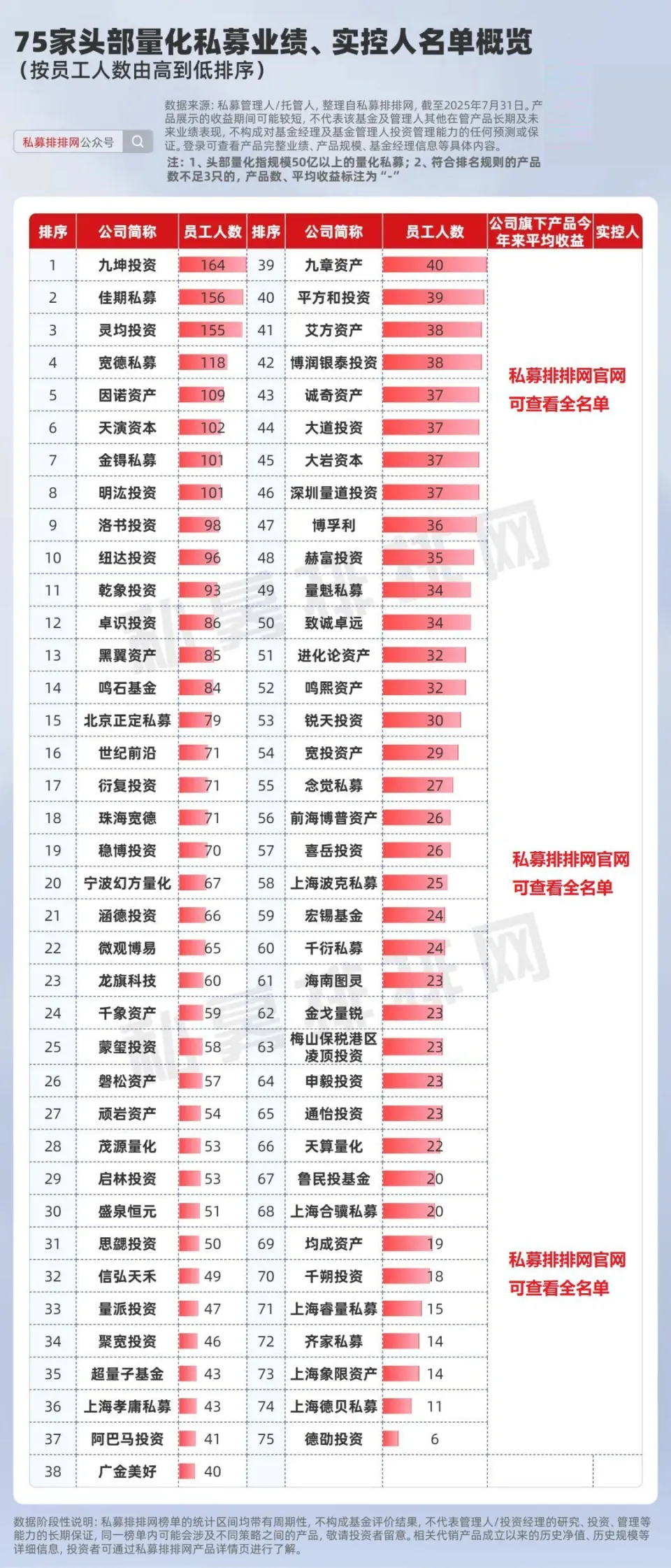 今年 以来,量化私募事迹 在市场活动性回升、小市值板块体现更优的行情下全面 开花 ,不少中小型私募进入到头部私募行列。私募排排网体现,停止7月31日,头部量化私募(管理规模50亿以上)共有75家,和2024岁尾 相比 ,年