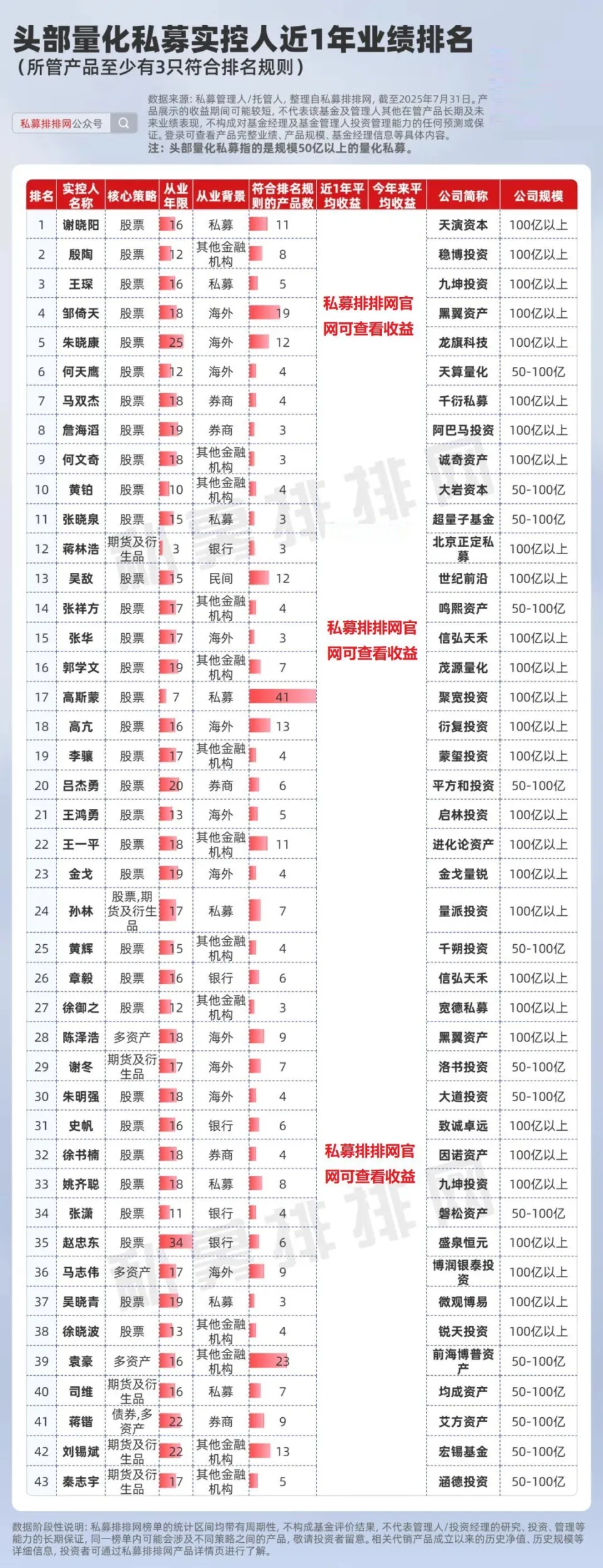 今年 以来,量化私募事迹 在市场活动性回升、小市值板块体现更优的行情下全面 开花 ,不少中小型私募进入到头部私募行列。私募排排网体现,停止7月31日,头部量化私募(管理规模50亿以上)共有75家,和2024岁尾 相比 ,年内进入(包罗新晋和重回)头部私募阵营的量化私募共有17家。 除了市场行情助推,量化私募的发展还和背后的实控人具有重大年夜 的关系。例如,今年 火出圈的梁文锋早年 便领导团队投身AI,颠末多年积累后成就了两家百亿量化巨擘 ,以及名震全球的大年夜 模子DeepSeek。那么,除了梁文锋以外,头部量化私募背后的实控人另有哪些?他们又饰演了怎样的角色呢? 头部量化私募实控人名单出炉!仅梁文锋1人实控2家头部量化 在75家头部量化私募中,百亿量化私募有44家,准百亿(管理规模50-100亿)量化私募有31家。从员工人数来看,在100人及以上的私募共有九坤投资、佳期私募等8家。 从公司旗下产品今年 以来平均收益来看,至少有3只产品符合 排名规矩 的头部量化私募共有50家,今年 均实现正收益,此中收益位居前10的头部量化私募依次为稳博投资、阿巴马投资、天演资本 、天算 量化、进化论资产、鸣熙资产、大年夜 岩资本 、龙旗科技、信弘天禾、宁波幻方量化,收益别离 为***%。 [应羁系请求 ,私募产品不克不及 公开展示事迹 ,文中涉及收益数据用***替代。] 从实控人角度看,天然人实控的头部量化私募共有72家,占比96%,别的有3家由机构实控。在72家天然人实控的头部量化私募中,九坤投资、黑翼资产、稳博投资、赫富投资4家量化私募由两位天然人共同实控。值得注意的是,同时实控两家头部量化私募(宁波幻方量化、九章资产)的仅有梁文锋1人。 ![]() 最新消息体现,《财富》(中文版)克日宣布 “中国40位40岁以下的商界精英”榜单,DeepSeek开创 人、双百亿量化私募实控人梁文锋位列第1。 梁文锋本科与研究生均就读于浙江大年夜 学,2015年建立幻方量化,专注AI驱动的量化投资研究与实践。2023年7月,他正式建立DeepSeek,进军通用人工智能领域 。克日,有市场传言称,DeepSeek R2有望在8月15日至30日期间宣布 。对此,DeepSeek内部人士向媒体体现,上述消息不属实。 数据体现,梁文锋实控的私募宁波幻方量化、九章资产旗下共有13只产品有事迹 展示。这13只产品均为量化多头计谋,别离 由徐进、陆政哲、陈哲三位基金经理 管理。此中超额收益最高的是徐进管理的“九章幻方沪深300量化多计谋1号”,今年 来收益、超额收益别离 为***%、***%。 ![]() 43名头部私募实控人事迹 曝光!谢晓阳、殷陶分夺冠亚军 如果对头部量化私募实控人举行进一步挖掘,不少头部量化的天然人实控人还担当公司投研总监、基金经理 等要职。相比 起主观私募,相比 主观私募,量化私募基金经理 或实控人较少于各大年夜 外交平台积极发声,但他们的亮眼事迹 也吸引了众多 投资者的关注。 私募排排网数据体现,所管的产品有近1年至少有3只符合 排名规矩 的头部量化私募实控人共有43名,平均收益为***%。从所属公司规模来看,百亿私募共有29家,规模50-100亿私募共有14家。从实控人的从业背景 来看,具有其他金融机构、海外从业背景 的实控人较多,别离 有13人、11人。 近1年收益位居前10的实控人别离 为:天演资本 谢晓阳、稳博投资殷陶、九坤投资王琛、黑翼资产邹倚天、龙旗科技朱晓康、天算 量化何天鹰、千衍私募马双杰、阿巴马投资詹海滔、诚奇资产何文奇、大年夜 岩资本 黄铂。 ![]() 天演资本 谢晓阳夺得第1,所管的11只产品近1年平均收益为***%,此中今年 来平均收益为***%。 谢晓阳为剑桥大年夜 学工程学学士,伦敦政治经济学院金融学硕士,曾于伦敦自营交易公司Tibra Capital任投资经理 ,负责欧洲列国 股指期权做市。他于2014年发起设立天演资本 ,担当公司的投资总监。 位列第2的是稳博投资殷陶,所管的8只产品近1年平均收益为***%,此中今年 来平均收益在上榜的基金经理 中最高,达到***%。 殷陶结业于上海交通大年夜 学联读班,为计算机专业本硕博,是稳博投资的开创 人之一。建立初期,他使用完整 自创的方法举行高频交易,中期构建了基于人工智能机器学习 的研究方法系统 。殷陶现在担当股票Alpha负责人,进一步融合天下各家一流机构方法,形成了具有稳博特色的以多因子为基础融合人工智能机器学习 方法的量化研究和交易系统 。 天算 量化的何天鹰为事迹 最好准百亿量化私募实控人,所管的4只产品近1年、今年 来平均收益别离 为***%、***%。 何天鹰为麻省理工学院金融工程硕士、清华大年夜 学经济学学士,曾于中金公司从事海外对冲基金母基金营业 ,负责基金尽调和研究,覆盖Two Sigma,Winton,AQR等。还曾于全球第二大年夜 基金公司富达基金(Fidelity)研究股票量化计谋,包罗多因子选股,风控优化模子等。 别的一位位列10强的准百亿量化私募实控人是大年夜 岩资本 的黄铂,所管的4只产品近1年、今年 来平均收益别离 为***%、***%。 黄铂为哥伦比亚大年夜 学运筹学博士、密歇根州立大年夜 学数学统计双硕士、北京大年夜 学数学学士。在美国期间,黄铂曾先后在谷歌和美林证券量化交易部工作。2014年与美林和高盛同事共同建立量化对冲公司Arxis Capital,LLC,并担当焦点数据科学家和量化计谋师,主要负责开发及应用 统计和机器学习 模子于日内中 高频交易。2017年参加大年夜 
